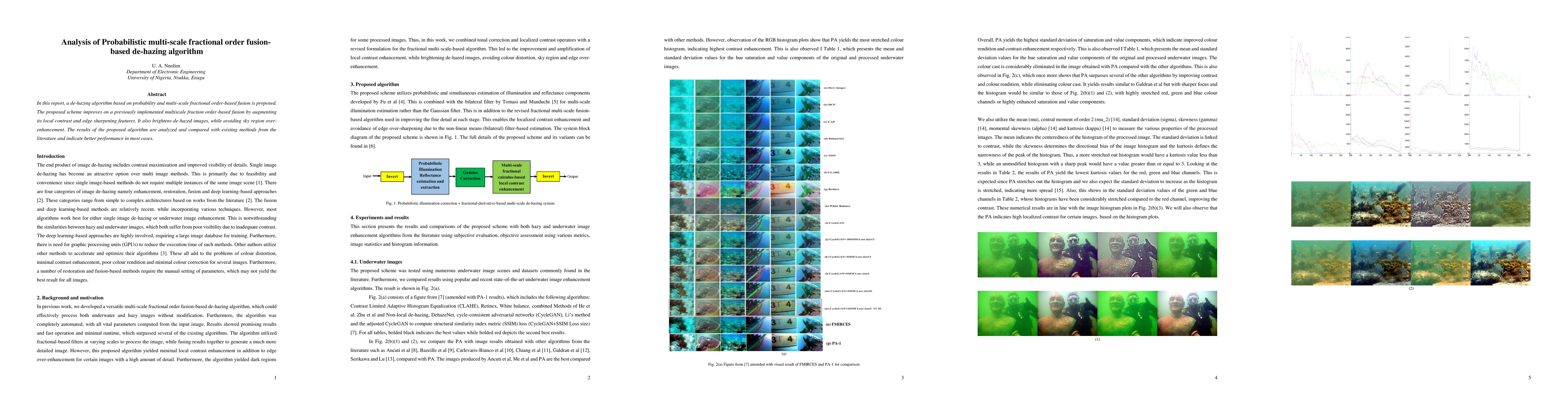 In this report, a de-hazing algorithm based on probability and multi-scale fractional order-based fusion is proposed. The proposed scheme improves on a previously implemented multiscale fraction order-based fusion by augmenting its local contrast and edge sharpening features. It also brightens de-hazed images, while avoiding sky region over-enhancement. The results of the proposed algorithm are analyzed and compared with existing methods from the literature and indicate better performance in most cases.