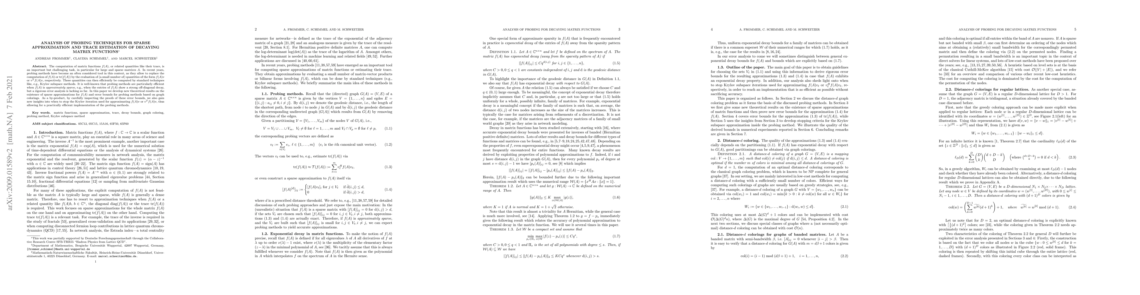 This paper presents new theoretical results on the efficiency of probing methods for computing matrix functions f(A) or their trace, tr(f(A)), for large sparse matrices A. These methods, which involve evaluating f(A)v or v^Tf(A)v, are particularly effective when f(A) is approximately sparse. The research introduces error bounds based on graph colorings and provides insights into determining the optimal iteration stoppoint for Krylov subspace methods, enabling practical and efficient implementation of probing techniques.