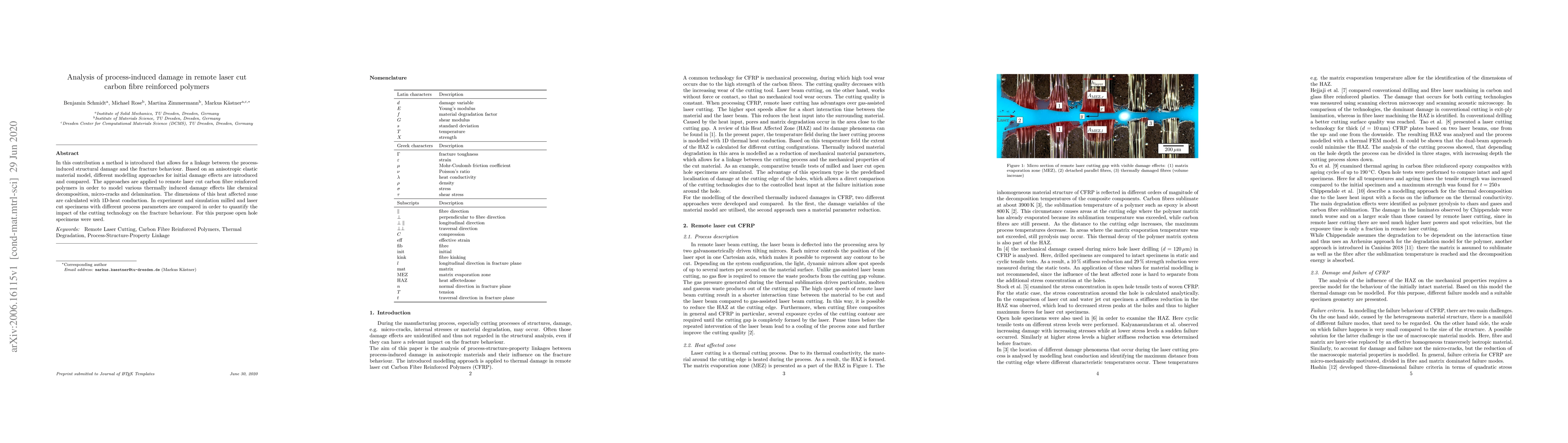 This paper introduces a method linking process-induced damage to fracture behavior in remote laser cut carbon fibre reinforced polymers, employing an anisotropic elastic model to compare different damage effect approaches. Experimental and simulation results quantify the impact of cutting technology on fracture behavior using open hole specimens.
