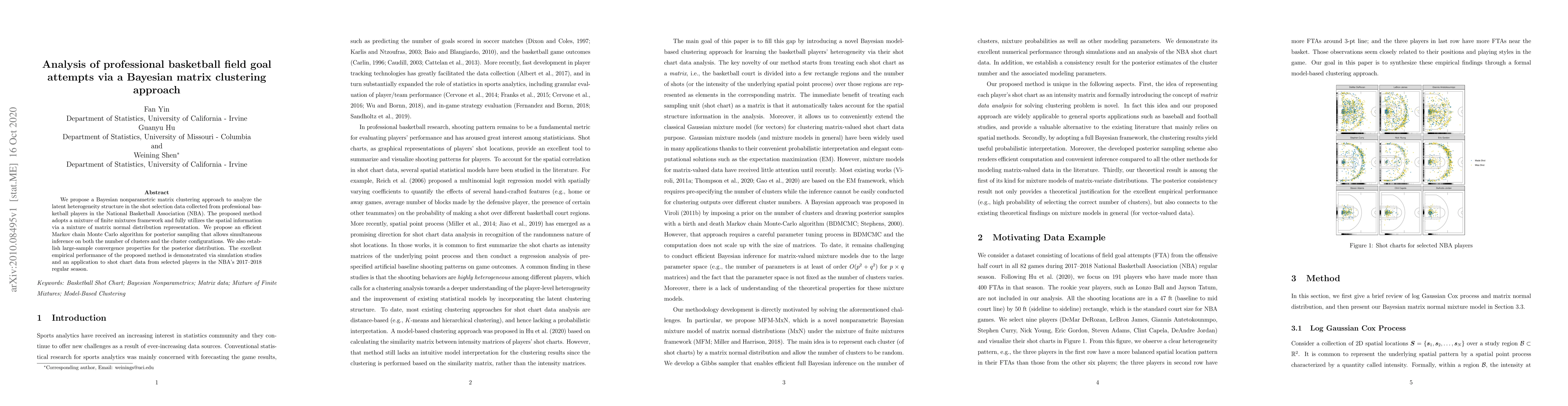 This paper introduces a Bayesian nonparametric matrix clustering method to analyze shot selection data from NBA players, utilizing spatial information and a mixture of matrix normal distributions. The method employs a Markov chain Monte Carlo algorithm for posterior sampling and demonstrates strong performance through simulations and an application to 2017-18 NBA shot chart data.
