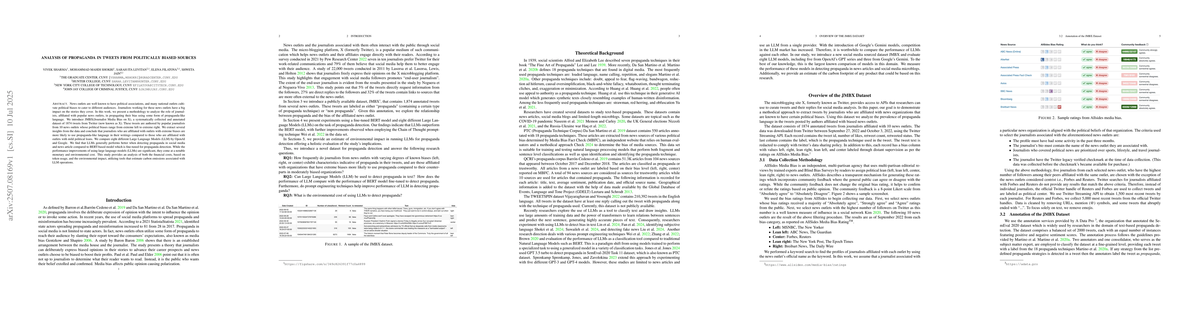 News outlets are well known to have political associations, and many national outlets cultivate political biases to cater to different audiences. Journalists working for these news outlets have a big impact on the stories they cover. In this work, we present a methodology to analyze the role of journalists, affiliated with popular news outlets, in propagating their bias using some form of propaganda-like language. We introduce JMBX(Journalist Media Bias on X), a systematically collected and annotated dataset of 1874 tweets from Twitter (now known as X). These tweets are authored by popular journalists from 10 news outlets whose political biases range from extreme left to extreme right. We extract several insights from the data and conclude that journalists who are affiliated with outlets with extreme biases are more likely to use propaganda-like language in their writings compared to those who are affiliated with outlets with mild political leans. We compare eight different Large Language Models (LLM) by OpenAI and Google. We find that LLMs generally performs better when detecting propaganda in social media and news article compared to BERT-based model which is fine-tuned for propaganda detection. While the performance improvements of using large language models (LLMs) are significant, they come at a notable monetary and environmental cost. This study provides an analysis of both the financial costs, based on token usage, and the environmental impact, utilizing tools that estimate carbon emissions associated with LLM operations.