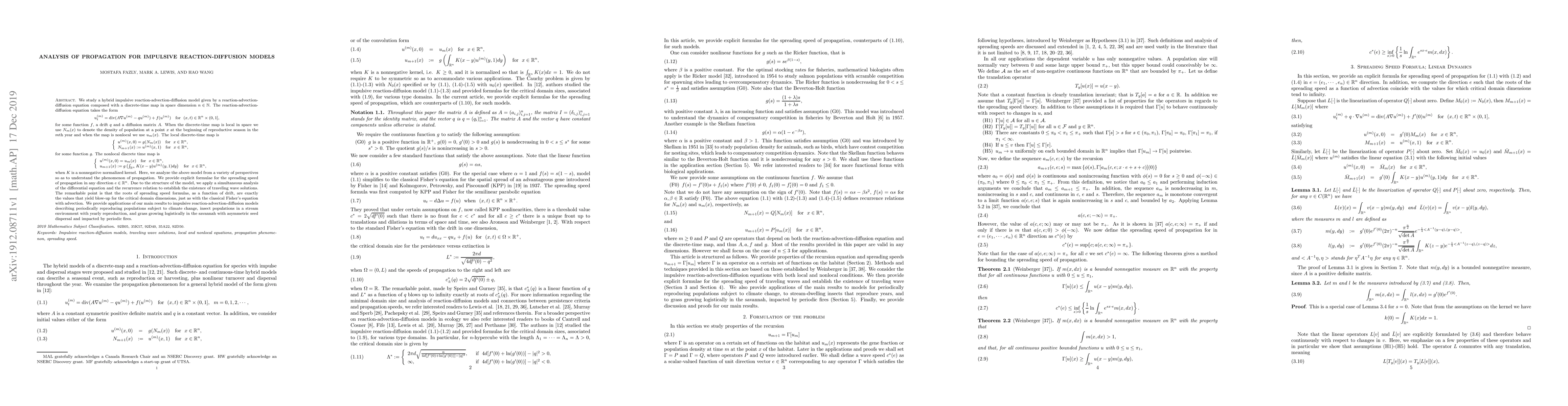 We study a hybrid impulsive reaction-advection-diffusion model given by a reaction-advection-diffusion equation composed with a discrete-time map in space dimension $n\in\mathbb N$. The reaction-advection-diffusion equation takes the form \begin{equation*}\label{} u^{(m)}_t = \text{div}(A\nabla u^{(m)}-q u^{(m)}) + f(u^{(m)}) \quad \text{for} \ \ (x,t)\in\mathbb R^n \times (0,1] , \end{equation*} for some function $f$, a drift $q$ and a diffusion matrix $A$. When the discrete-time map is local in space we use $N_m(x)$ to denote the density of population at a point $x$ at the beginning of reproductive season in the $m$th year and when the map is nonlocal we use $u_m(x)$. The local discrete-time map is \begin{eqnarray*}\label{}\left\{ \begin{array}{lcl} u^{(m)}(x,0) = g(N_m(x)) \quad \text{for} \ \ x\in \mathbb R^n , \\ N_{m+1}(x):=u^{(m)}(x,1) \quad \text{for} \ \ x\in \mathbb R^n , \end{array}\right. \end{eqnarray*} for some function $g$. The nonlocal discrete time map is \begin{eqnarray*}\label{}\left\{ \begin{array}{lcl} u^{(m)}(x,0) = u_{m}(x) \quad \text{for} \ \ x\in \mathbb R^n , \\ \label{mainb2} u_{m+1}(x) := g\left(\int_{\mathbb R^n} K(x-y)u^{(m)}(y,1) dy\right) \quad \text{for} \ \ x\in \mathbb R^n, \end{array}\right. \end{eqnarray*} when $K$ is a nonnegative normalized kernel. SEE THE ARTICLE FOR COMPLETE ABSTRACT.