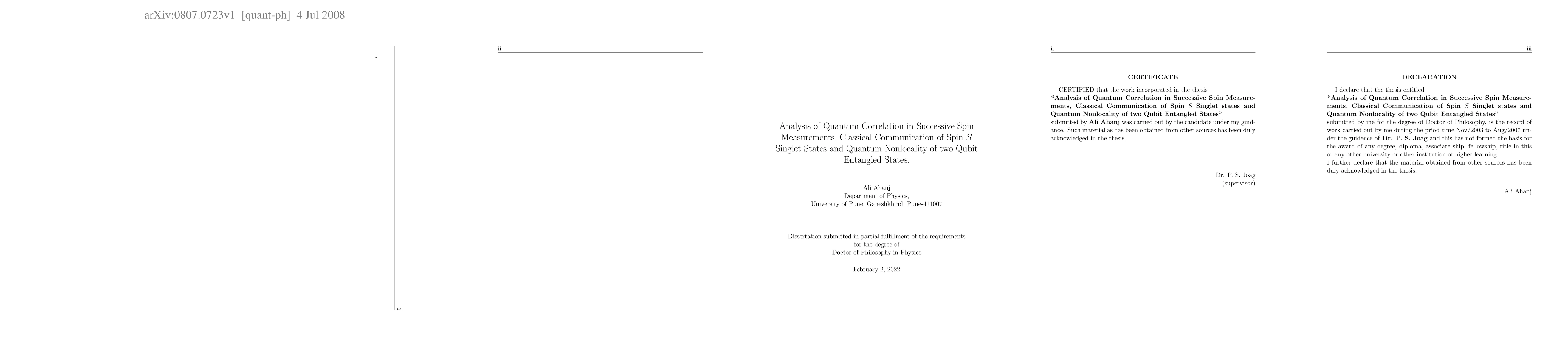 In this thesis, we study about three subjects 1- Classical simulation of two spin-$s$ singlet correlations for all $s$ involving spin measurements, 2- Quantum correlations in successive single spin measurements, 3- Non locality without inequality for almost all two-qubit entangled states based on Cabello's non locality argument.