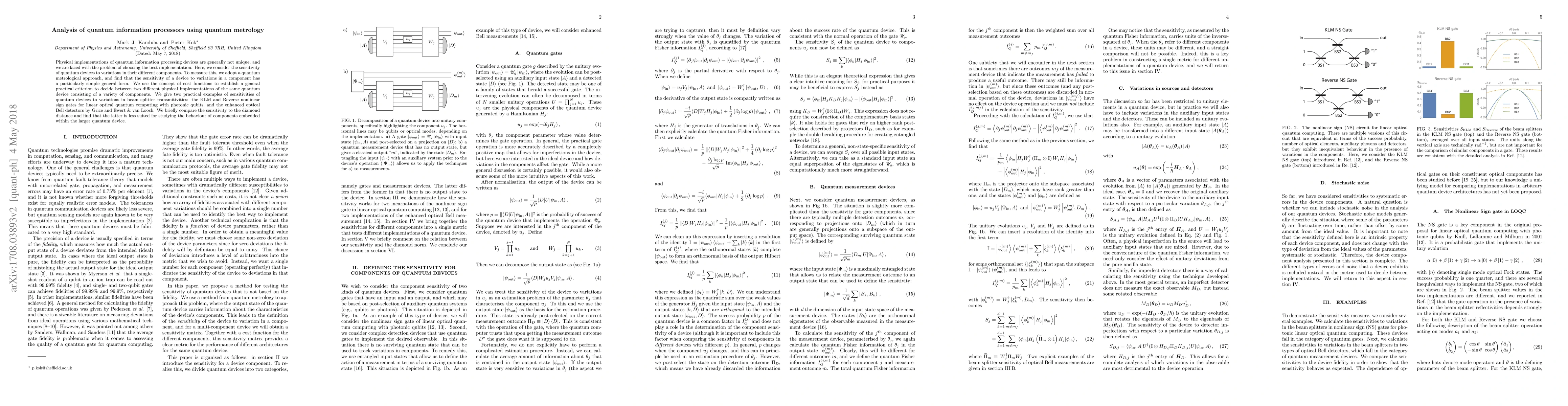 Physical implementations of quantum information processing devices are generally not unique, and we are faced with the problem of choosing the best implementation. Here, we consider the sensitivity of quantum devices to variations in their different components. To measure this, we adopt a quantum metrological approach, and find that the sensitivity of a device to variations in a component has a particularly simple general form. We use the concept of cost functions to establish a general practical criterion to decide between two different physical implementations of the same quantum device consisting of a variety of components. We give two practical examples of sensitivities of quantum devices to variations in beam splitter transmitivities: the KLM and Reverse nonlinear sign gates for linear optical quantum computing with photonic qubits, and the enhanced optical Bell detectors by Grice and Ewert & van Loock. We briefly compare the sensitivity to the diamond distance and find that the latter is less suited for studying the behaviour of components embedded within the larger quantum device.