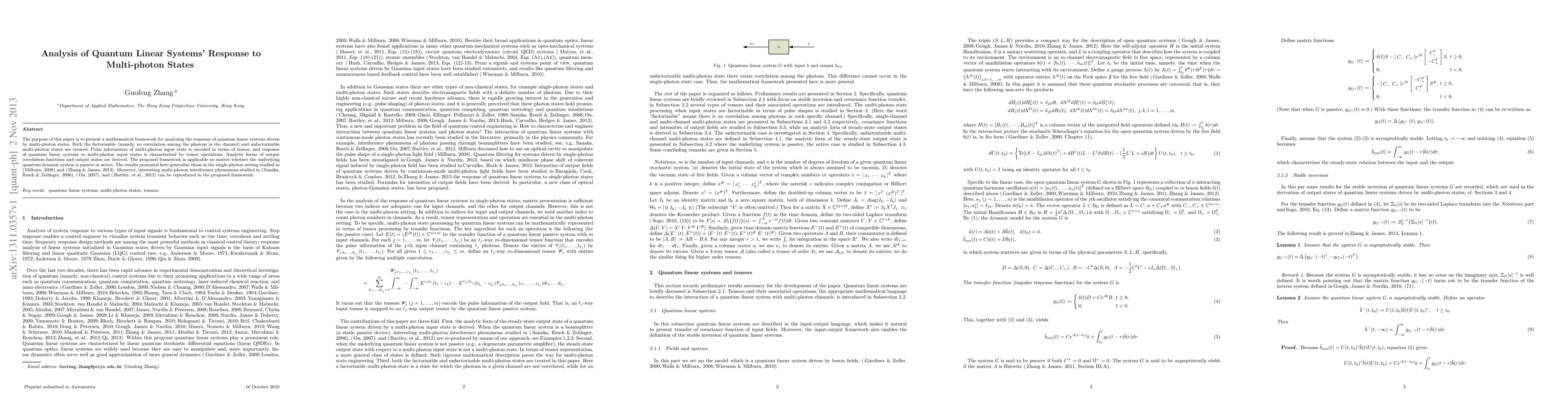 This paper develops a mathematical framework to analyze the response of quantum linear systems to multi-photon states, encompassing both factorizable and unfactorizable cases. The framework generalizes previous single-photon studies and reproduces multi-photon interference phenomena.