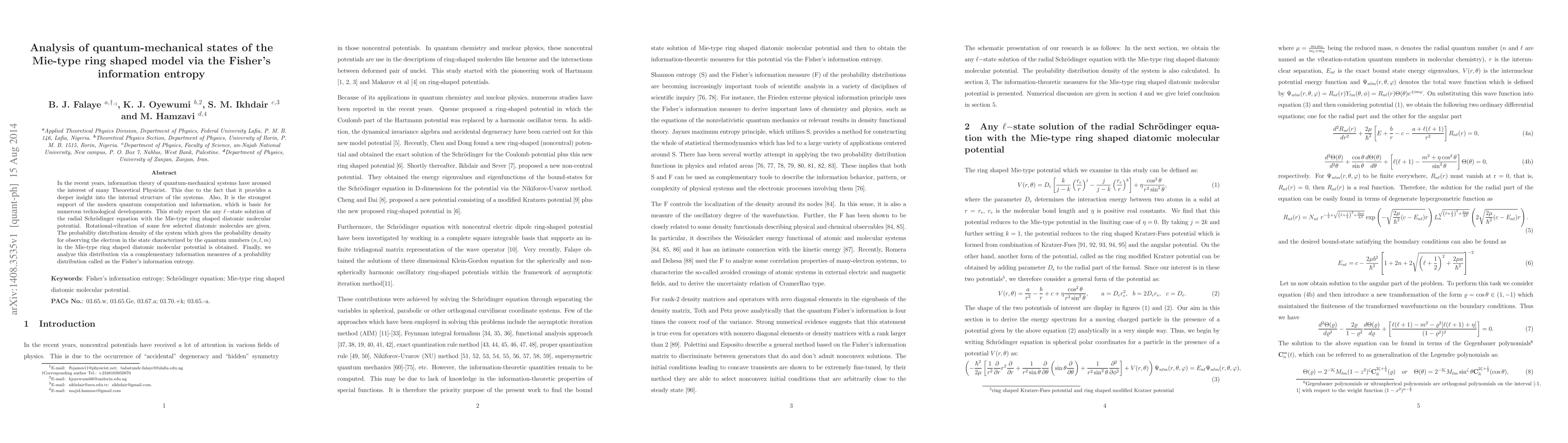 This paper investigates quantum-mechanical states of a Mie-type ring shaped diatomic molecular model using the Fisher's information entropy to gain deeper insights into the system's internal structure. The study derives the probability distribution for electron states and analyzes it to support advancements in quantum computation and information technology.