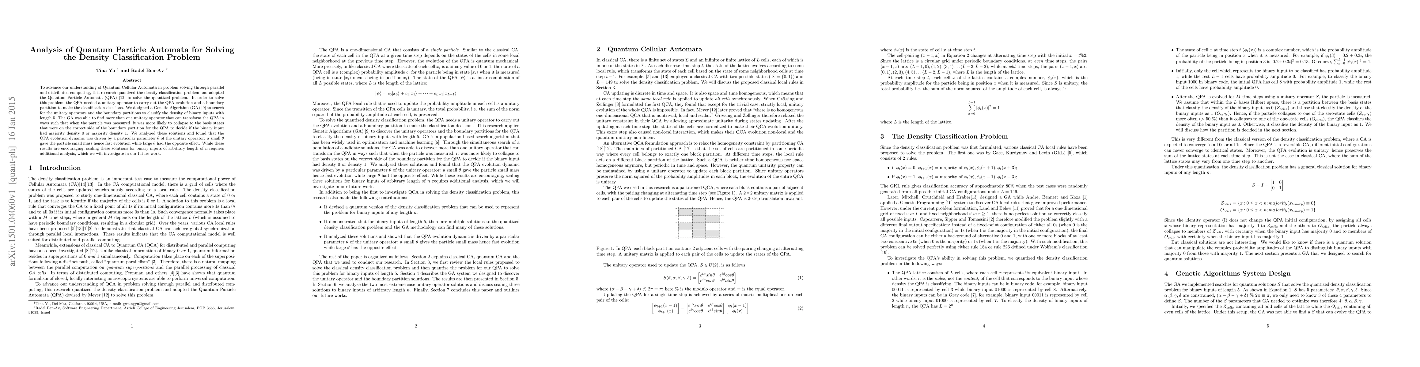 To advance our understanding of Quantum Cellular Automata in problem solving through parallel and distributed computing, this research quantized the density classification problem and adopted the Quantum Particle Automata (QPA) to solve the quantized problem. In order to solve this problem, the QPA needed a unitary operator to carry out the QPA evolution and a boundary partition to make the classification decisions. We designed a Genetic Algorithm (GA) to search for the unitary operators and the boundary partitions to classify the density of binary inputs with length 5. The GA was able to find more than one unitary operator that can transform the QPA in ways such that when the particle was measured, it was more likely to collapse to the basis states that were on the correct side of the boundary partition for the QPA to decide if the binary input had majority density 0 or majority density 1. We analyzed these solutions and found that the QPA evolution dynamic was driven by a particular parameter $\theta$ of the unitary operator: a small $\theta$ gave the particle small mass hence fast evolution while large $\theta$ had the opposite effect. While these results are encouraging, scaling these solutions for binary inputs of arbitrary length of $n$ requires additional analysis, which we will investigate in our future work.