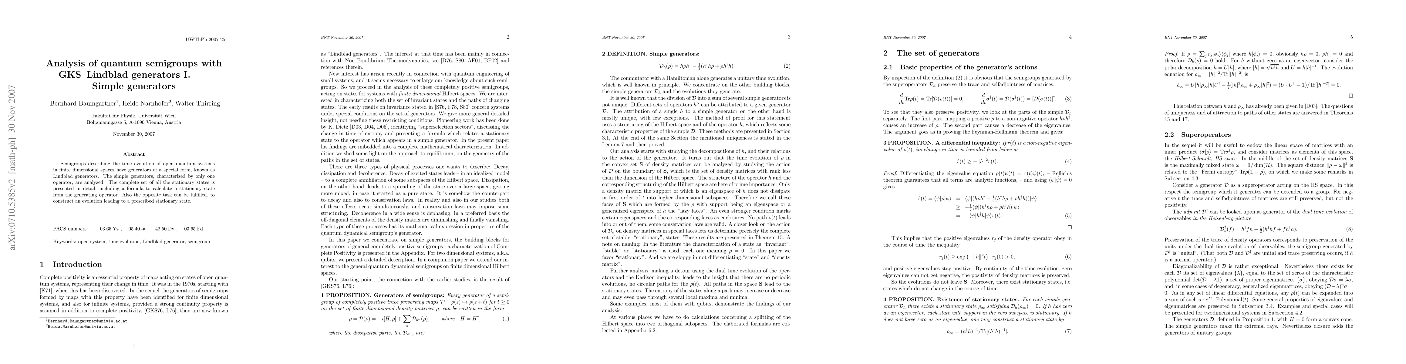 This paper analyzes simple quantum semigroups with GKS-Lindblad generators, focusing on single-operator generators. It provides a comprehensive set of all stationary states and a formula to derive a stationary state from the generating operator, along with methods to construct evolutions leading to specific stationary states.