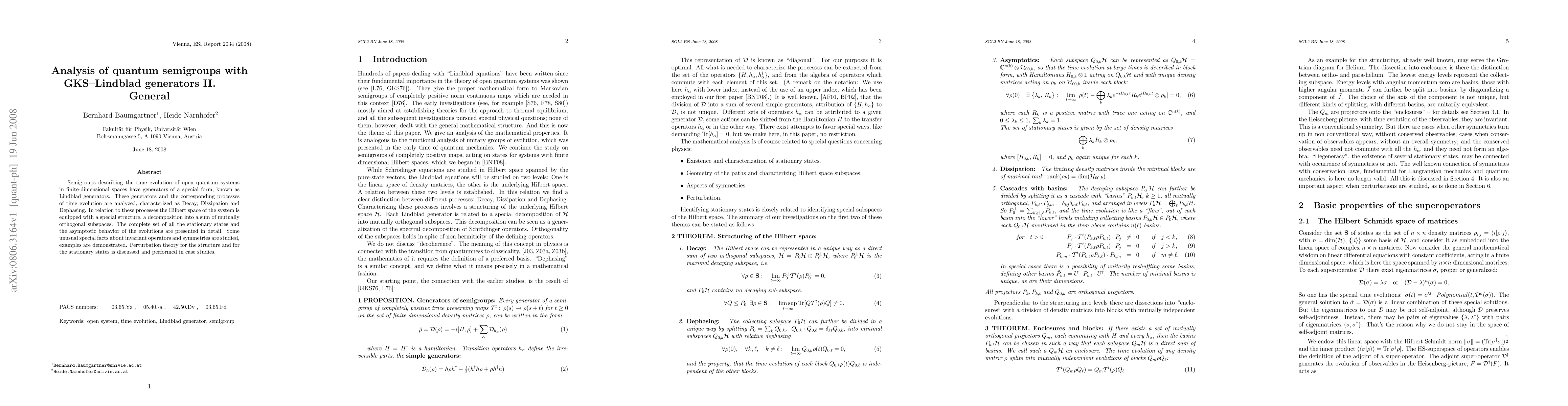 Semigroups describing the time evolution of open quantum systems in finite-dimensional spaces have generators of a special form, known as Lindblad generators. These generators and the corresponding processes of time evolution are analyzed, characterized as Decay, Dissipation and Dephasing. In relation to these processes the Hilbert space of the system is equipped with a special structure, a decomposition into a sum of mutually orthogonal subspaces. The complete set of all the stationary states and the asymptotic behavior of the evolutions are presented in detail. Some unusual special facts about invariant operators and symmetries are studied, examples are demonstrated. Perturbation theory for the structure and for the stationary states is discussed and performed in case studies.