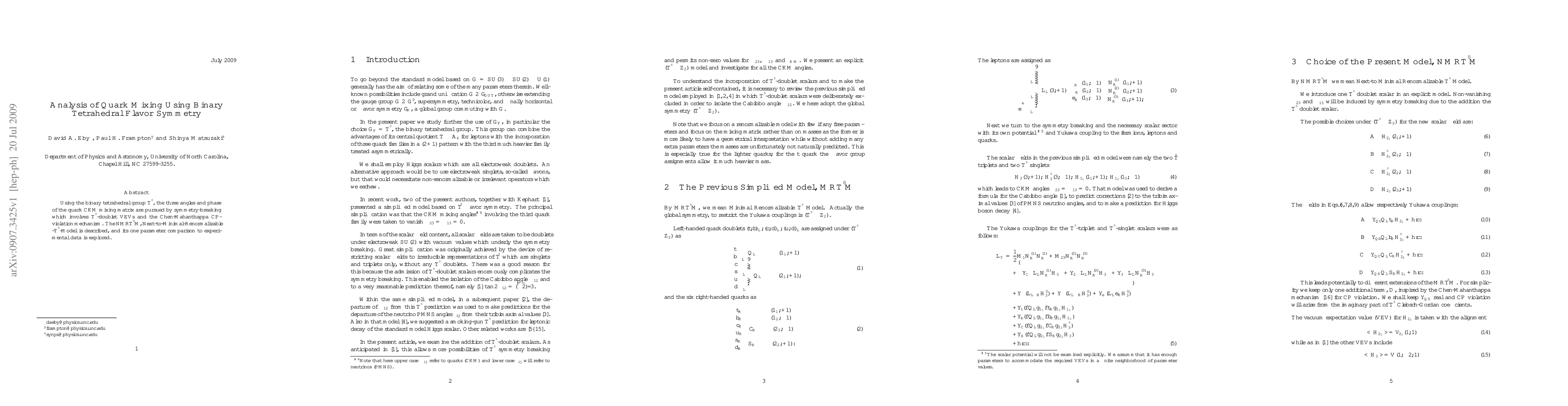 Using the binary tetrahedral group $T^{'}$, the three angles and phase of the quark CKM mixing matrix are pursued by symmetry-breaking which involves $T^{'}$-doublet VEVs and the Chen-Mahanthappa CP-violation mechanism. The NMRT$^{'}$M, Next-to-Minimal-Renormalizable -T$^{'}$-Model is described, and its one parameter comparison to experimental data is explored.