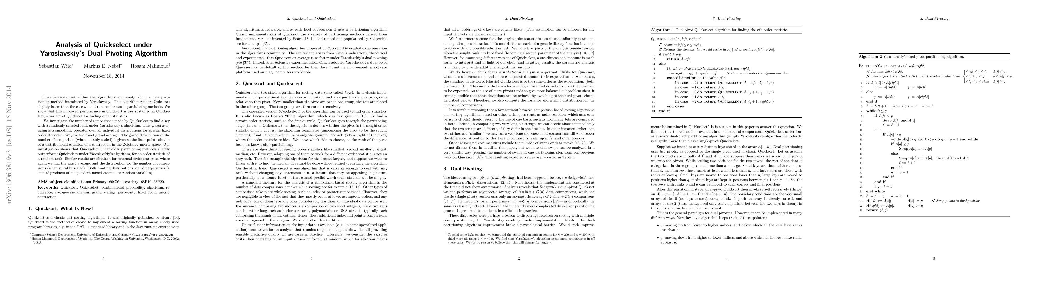 There is excitement within the algorithms community about a new partitioning method introduced by Yaroslavskiy. This algorithm renders Quicksort slightly faster than the case when it runs under classic partitioning methods. We show that this improved performance in Quicksort is not sustained in Quickselect; a variant of Quicksort for finding order statistics. We investigate the number of comparisons made by Quickselect to find a key with a randomly selected rank under Yaroslavskiy's algorithm. This grand averaging is a smoothing operator over all individual distributions for specific fixed order statistics. We give the exact grand average. The grand distribution of the number of comparison (when suitably scaled) is given as the fixed-point solution of a distributional equation of a contraction in the Zolotarev metric space. Our investigation shows that Quickselect under older partitioning methods slightly outperforms Quickselect under Yaroslavskiy's algorithm, for an order statistic of a random rank. Similar results are obtained for extremal order statistics, where again we find the exact average, and the distribution for the number of comparisons (when suitably scaled). Both limiting distributions are of perpetuities (a sum of products of independent mixed continuous random variables).