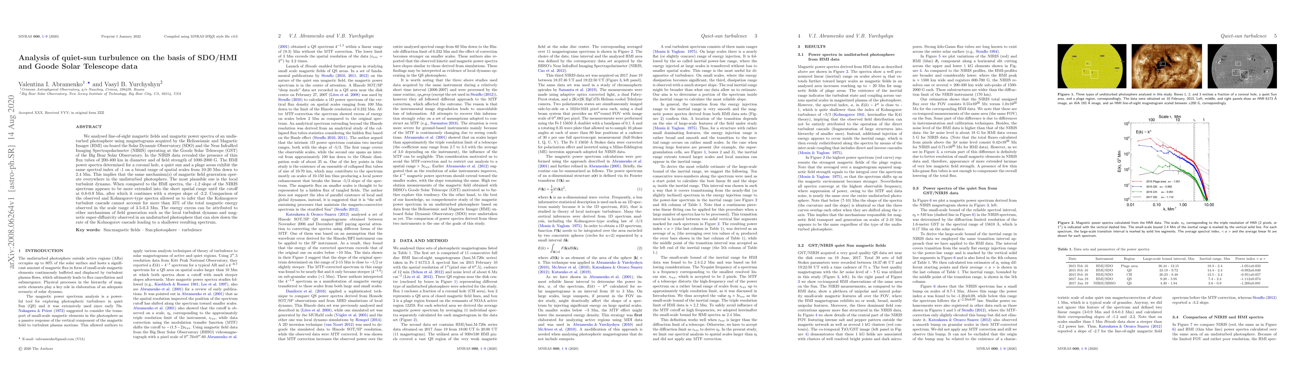 This study analyzes quiet-sun turbulence using SDO/HMI and Goode Solar Telescope data, revealing thin flux tubes and a uniform spectral index of -1 across different solar regions, suggesting a local turbulent dynamo. The NIRIS data show a steeper spectrum, indicating that the Kolmogorov cascade accounts for only 35% of the magnetic energy, with the rest attributed to other field generation mechanisms.