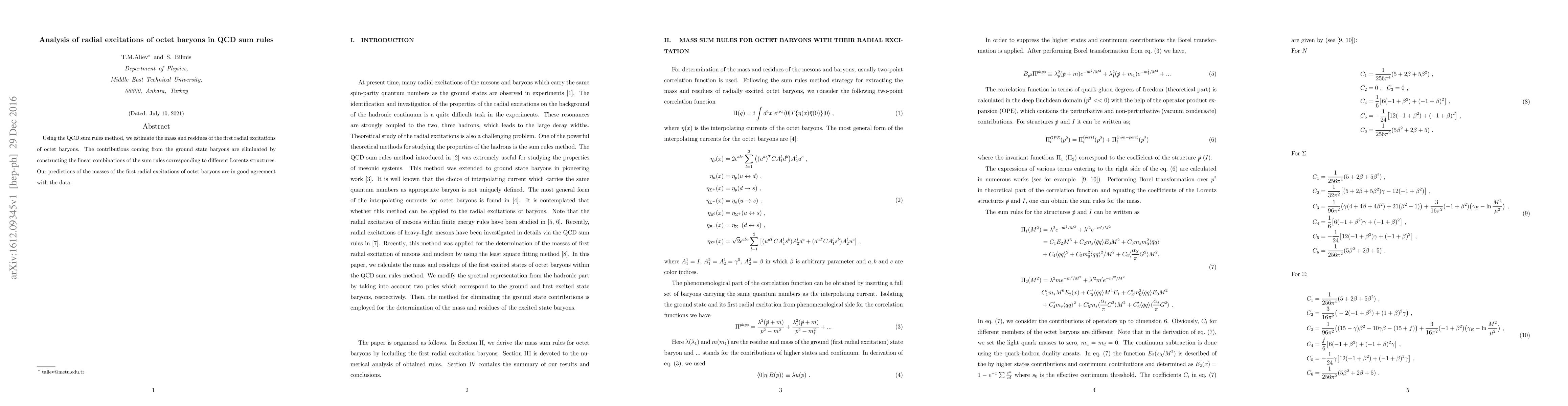 This paper employs QCD sum rules to estimate the mass and residues of the first radial excitations of octet baryons, effectively eliminating ground state contributions through specific sum rule combinations. The predicted masses align well with experimental data.