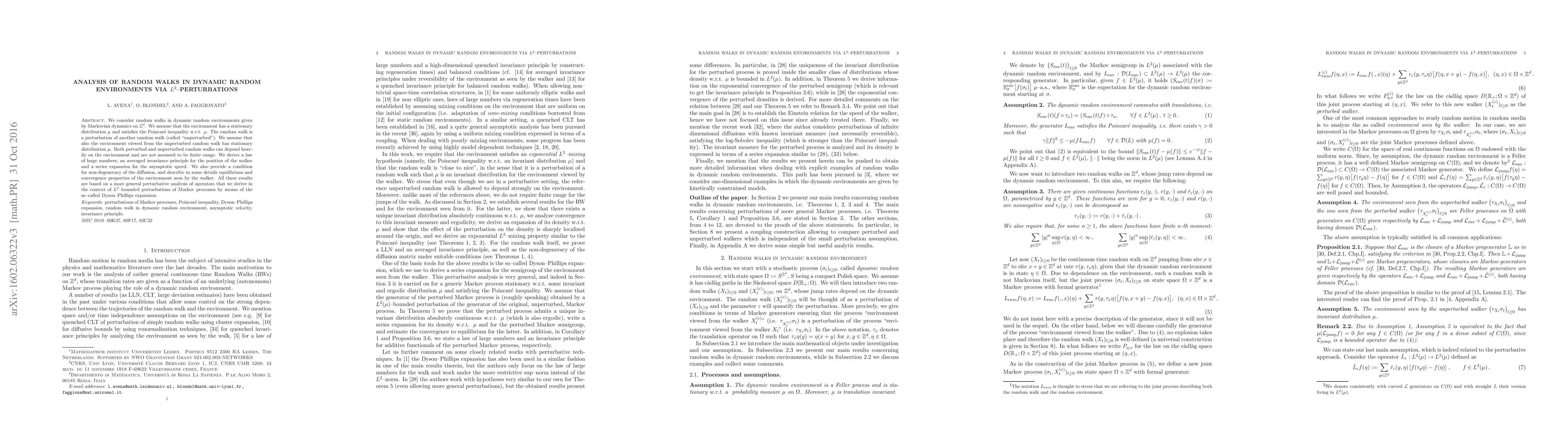 We consider random walks in dynamic random environments given by Markovian dynamics on $\mathbb{Z}^d$. We assume that the environment has a stationary distribution $\mu$ and satisfies the Poincar\'e inequality w.r.t. $\mu$. The random walk is a perturbation of another random walk (called "unperturbed"). We assume that also the environment viewed from the unperturbed random walk has stationary distribution $\mu$. Both perturbed and unperturbed random walks can depend heavily on the environment and are not assumed to be finite-range. We derive a law of large numbers, an averaged invariance principle for the position of the walker and a series expansion for the asymptotic speed. We also provide a condition for non-degeneracy of the diffusion, and describe in some details equilibrium and convergence properties of the environment seen by the walker. All these results are based on a more general perturbative analysis of operators that we derive in the context of $L^2$-bounded perturbations of Markov processes by means of the so-called Dyson-Phillips expansion.