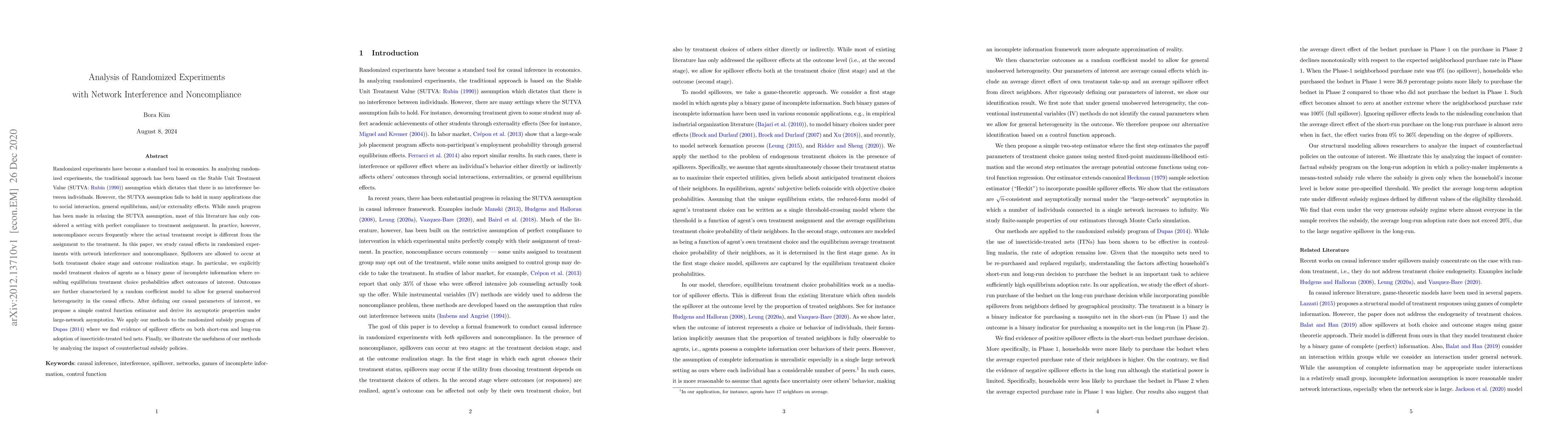 This paper examines randomized experiments with network interference and noncompliance, proposing a control function estimator to account for spillovers and treatment choice noncompliance. It applies the methodology to a subsidy program, finding evidence of spillover effects on insecticide-treated bed net adoption.