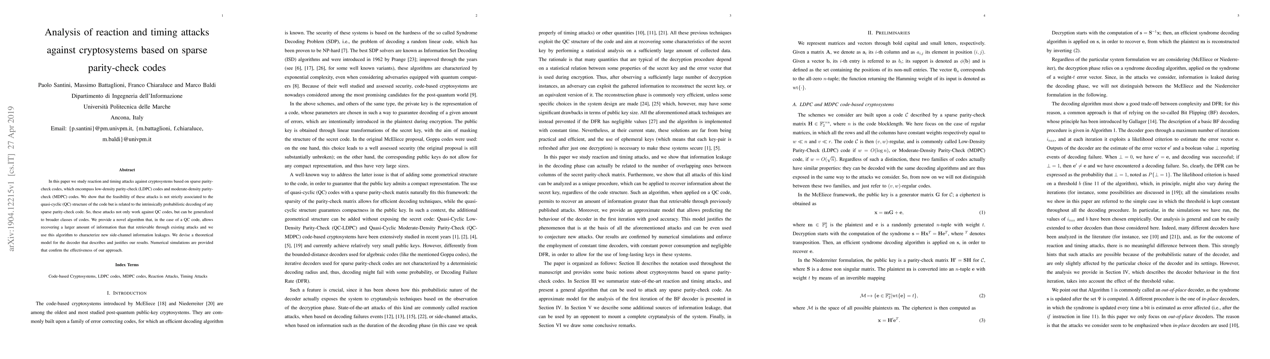 This paper analyzes reaction and timing attacks on cryptosystems using sparse parity-check codes, demonstrating that these attacks are linked to the probabilistic decoding process rather than the quasi-cyclic structure. A novel algorithm is introduced to recover more information than existing methods, supported by a theoretical model and confirmed by numerical simulations.