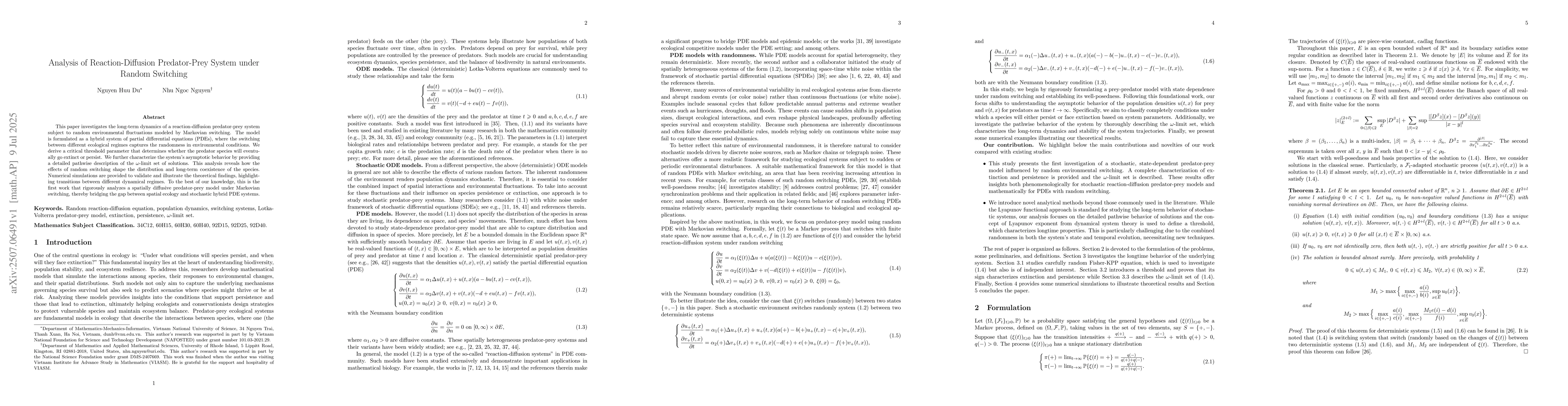 This paper investigates the long-term dynamics of a reaction-diffusion predator-prey system subject to random environmental fluctuations modeled by Markovian switching. The model is formulated as a hybrid system of partial differential equations (PDEs), where the switching between different ecological regimes captures the randomness in environmental conditions. We derive a critical threshold parameter that determines whether the predator species will eventually go extinct or persist. We further characterize the system's asymptotic behavior by providing a detailed pathwise description of the omega-limit set of solutions. This analysis reveals how the effects of random switching shape the distribution and long-term coexistence of the species. Numerical simulations are provided to validate and illustrate the theoretical findings, highlighting transitions between different dynamical regimes. To the best of our knowledge, this is the first work that rigorously analyzes a spatially diffusive predator-prey model under Markovian switching, thereby bridging the gap between spatial ecology and stochastic hybrid PDE systems.