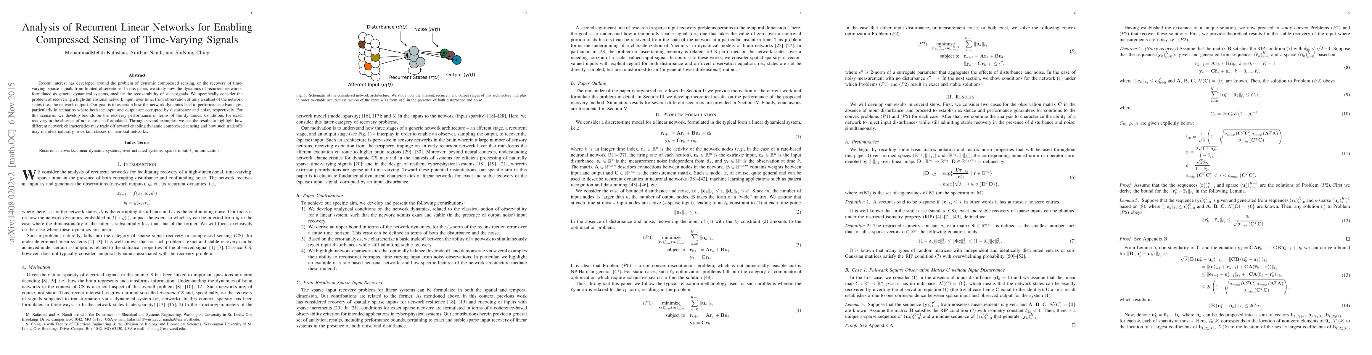 This paper investigates how recurrent linear networks, modeled as dynamical systems, can enable compressed sensing of time-varying, sparse signals from limited observations. It develops performance bounds and conditions for exact recovery, highlighting how network dynamics can provide advantages in noisy scenarios and how different network characteristics influence dynamic compressed sensing.