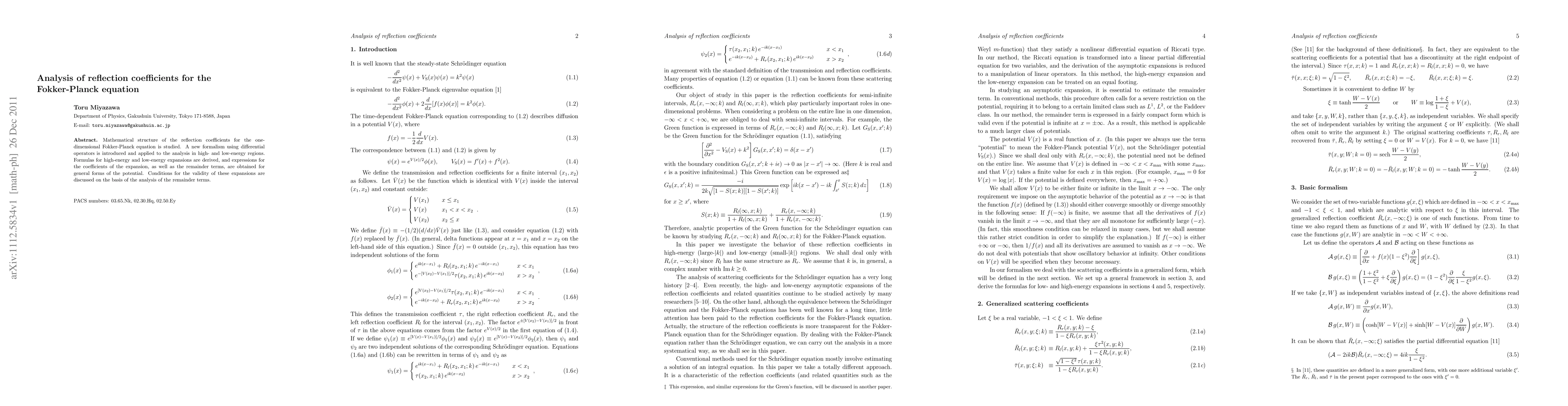 This paper introduces a new formalism using differential operators to analyze reflection coefficients for the one-dimensional Fokker-Planck equation, deriving high-energy and low-energy expansions and discussing conditions for their validity based on remainder term analysis.