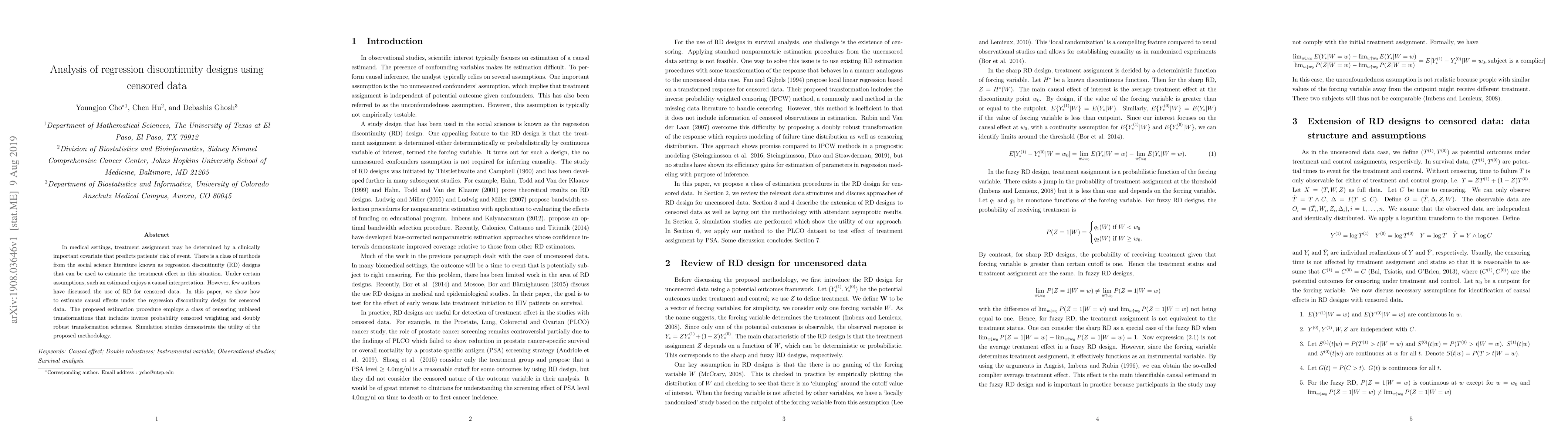 This paper proposes methods to estimate causal effects using regression discontinuity designs for censored data in medical settings. It introduces censoring unbiased transformations, including inverse probability weighting and doubly robust schemes, to handle censored data, validated through simulation studies.