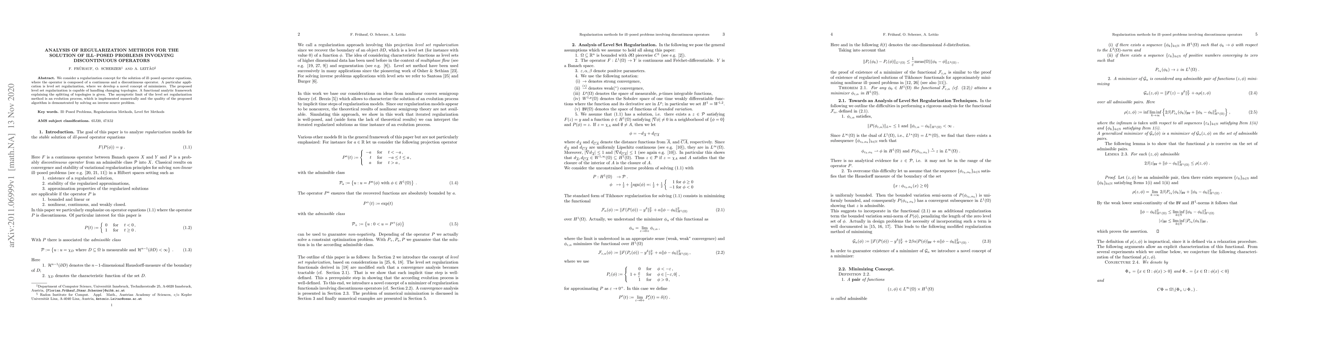We consider a regularization concept for the solution of ill--posed operator equations, where the operator is composed of a continuous and a discontinuous operator. A particular application is level set regularization, where we develop a novel concept of minimizers. The proposed level set regularization is capable of handling changing topologies. A functional analytic framework explaining the splitting of topologies is given. The asymptotic limit of the level set regularization method is an evolution process, which is implemented numerically and the quality of the proposed algorithm is demonstrated by solving an inverse source problem.