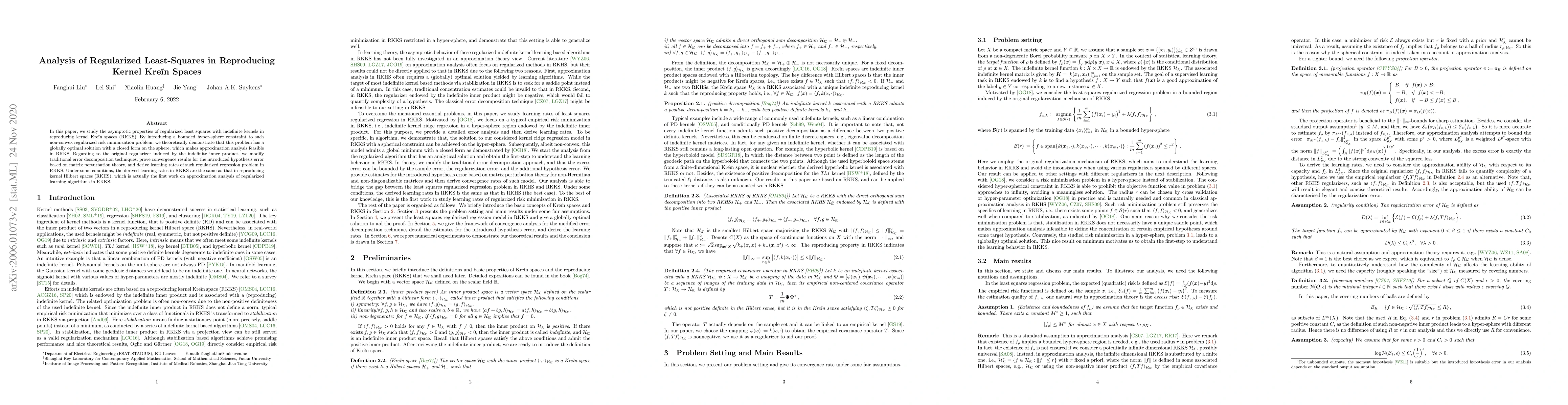 This paper investigates the asymptotic properties of regularized least squares in reproducing kernel Krein spaces, demonstrating a globally optimal solution with a closed form under a bounded hyper-sphere constraint. It also derives learning rates for the regularized regression problem, showing equivalence to those in reproducing kernel Hilbert spaces under certain conditions.