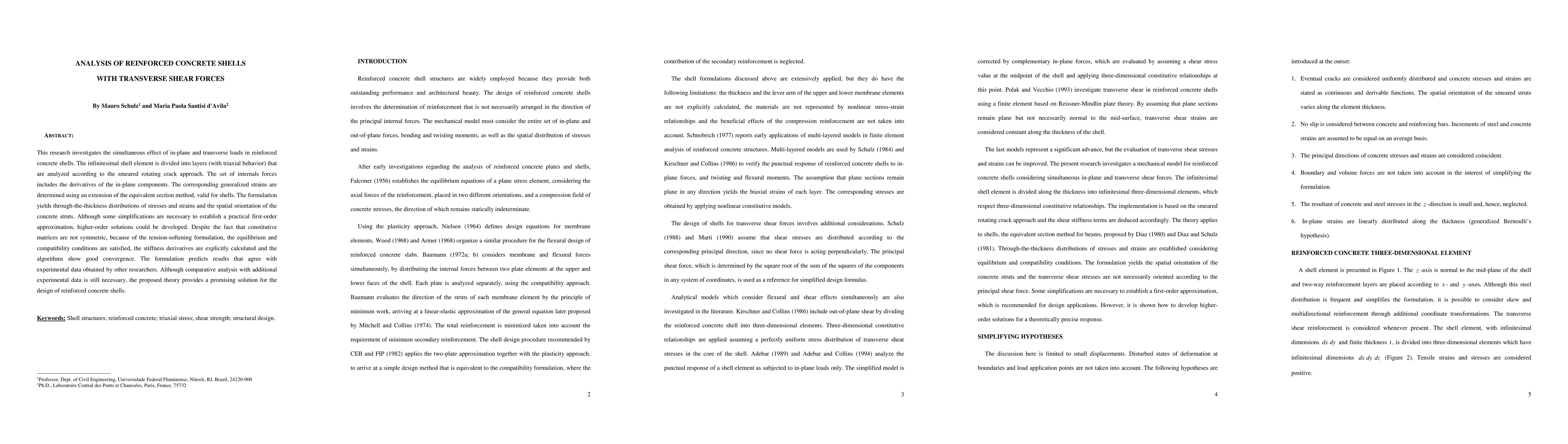 This paper presents a detailed analysis of reinforced concrete shells subjected to both in-plane and transverse loads, employing a smeared rotating crack approach and an extended equivalent section method. The proposed formulation accurately predicts stress and strain distributions, showing good convergence and agreement with existing experimental data.