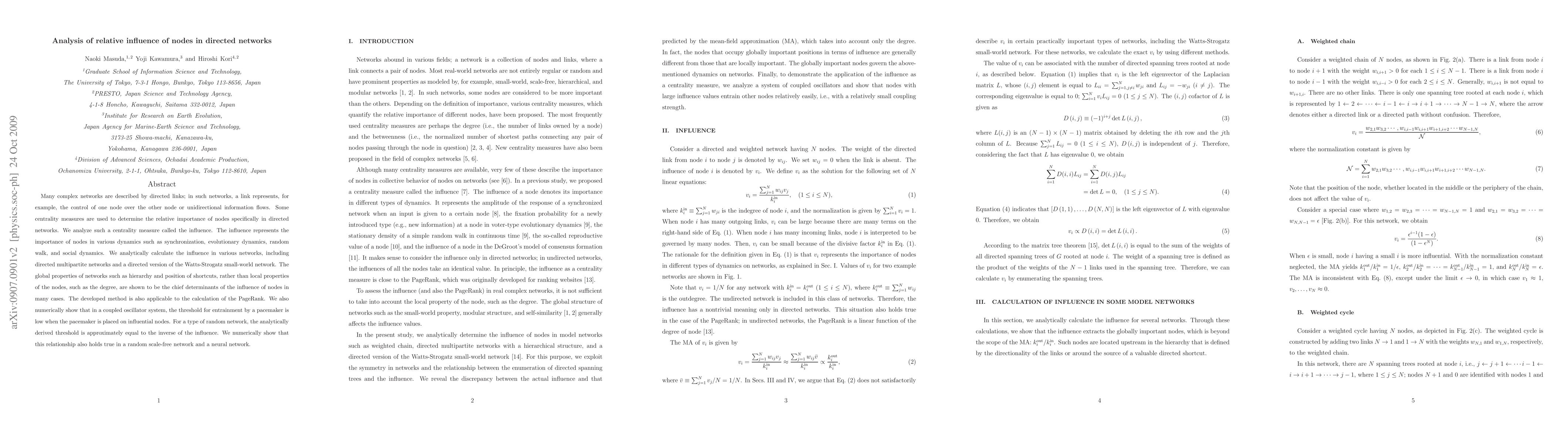 This paper analyzes the centrality measure called "influence" to determine the relative importance of nodes in directed networks, showing that global network properties often dictate node influence more than local node properties. The study also demonstrates the applicability of the method to calculate the PageRank and finds that influential nodes lower the entrainment threshold in coupled oscillator systems.