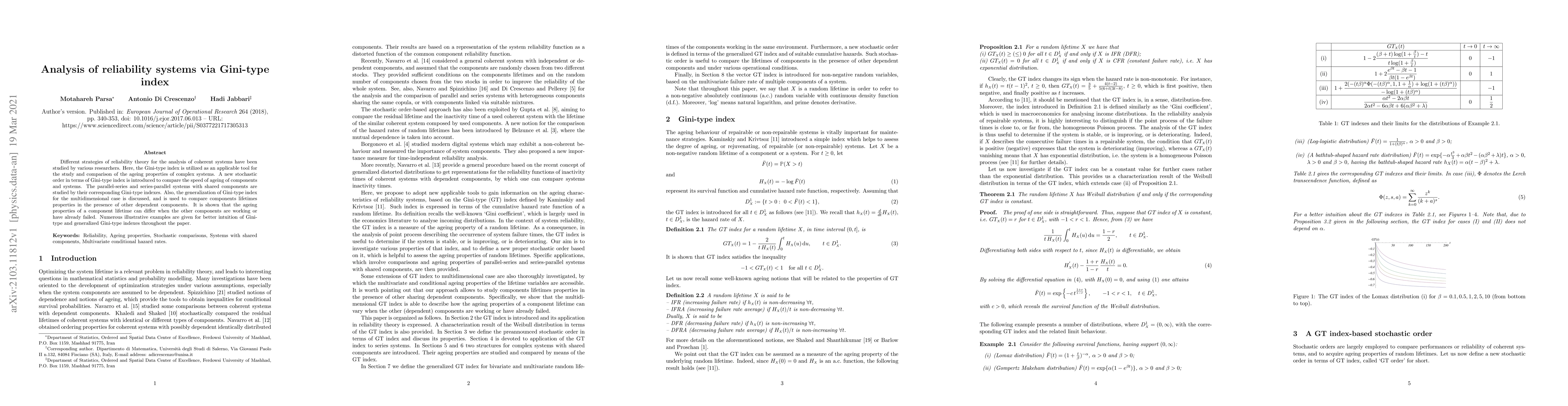 This paper introduces a Gini-type index to analyze the reliability of coherent systems and compares the ageing properties of components and systems. It proposes a new stochastic order using the Gini-type index and discusses its application to parallel-series and series-parallel systems, along with a multidimensional generalization for dependent components.