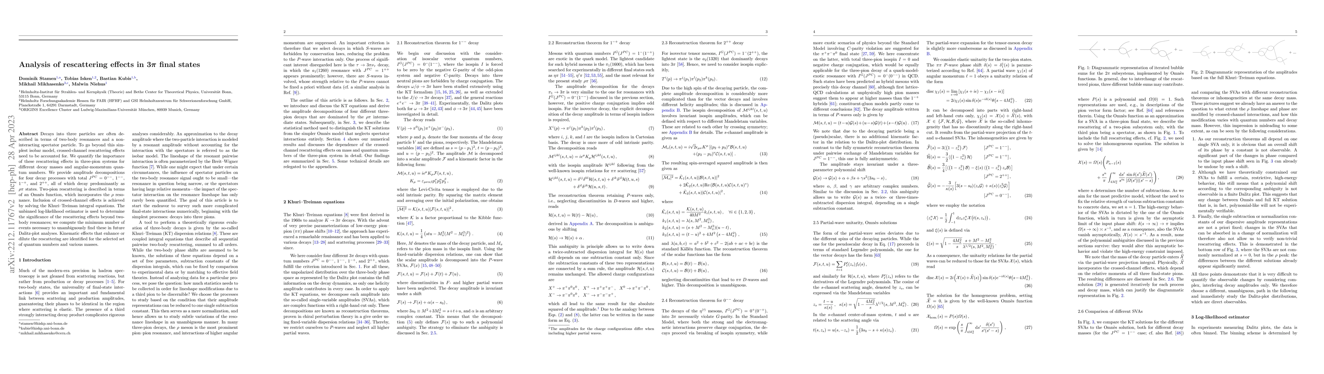 This paper analyzes the significance of crossed-channel rescattering effects in three-pion decay processes, providing amplitude decompositions for four specific decay modes. It employs the Khuri-Treiman integral equations and an unbinned log-likelihood estimator to quantify these effects, identifying kinematic factors that influence their presence.