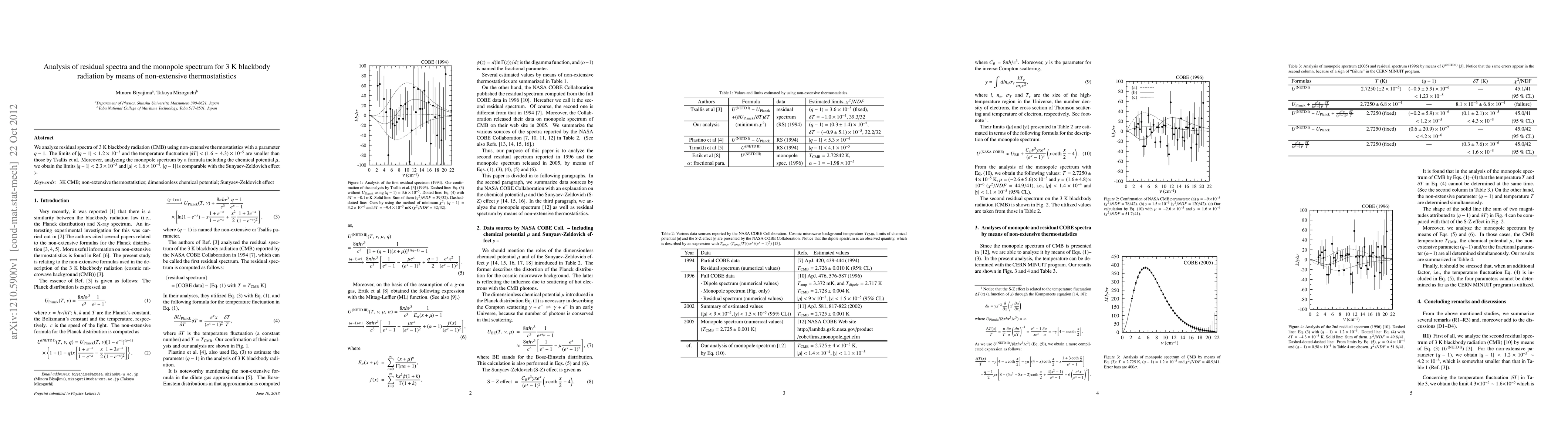 We analyze residual spectra of 3 K blackbody radiation (CMB) using non-extensive thermostatistics with a parameter q-1. The limits of |q-1|<1.2x10^{-5} and the temperature fluctuation |delta T|<(1.6-4.3)x10^{-5} are smaller than those by Tsallis et al. Moreover, analyzing the monopole spectrum by a formula including the chemical potential mu, we obtain the limits |q-1|<2.3x10^{-5} and |mu|<1.6x10^{-4}. |q-1| is comparable with the Sunyaev-Zeldovich effect y.
