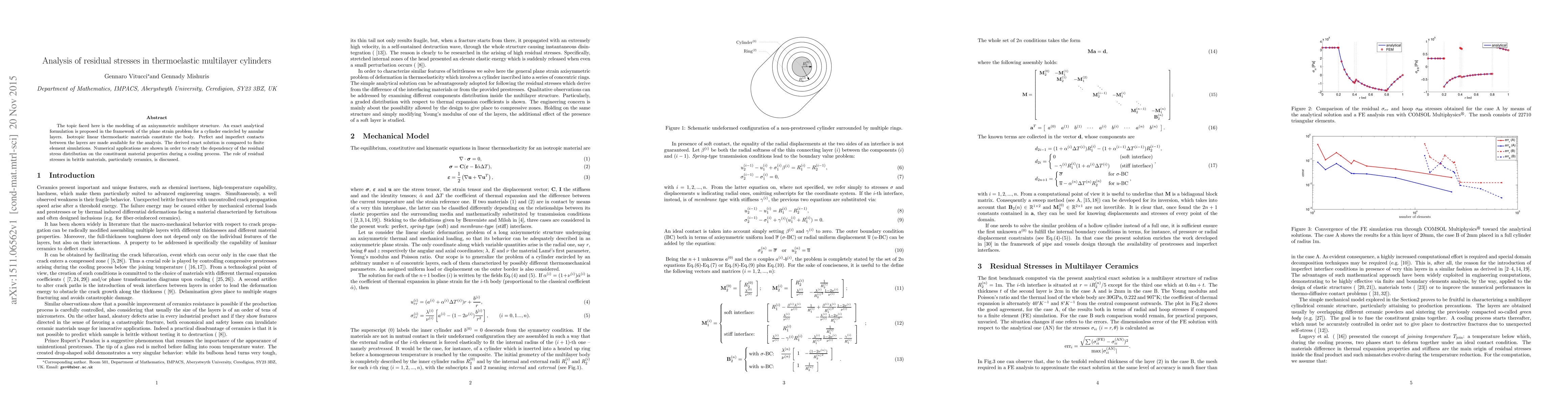The topic faced here is the modeling of an axisymmetric multilayer structure. An exact analytical formulation is proposed in the framework of the plane strain problem for a cylinder encircled by annular layers. Isotropic linear thermoelastic materials constitute the body. Perfect and imperfect contacts between the layers are made available for the analysis. The derived exact solution is compared to finite element simulations. Numerical applications are shown in order to study the dependency of the residual stress distribution on the constituent material properties during a cooling process. The role of residual stresses in brittle materials, particularly ceramics, is discussed.