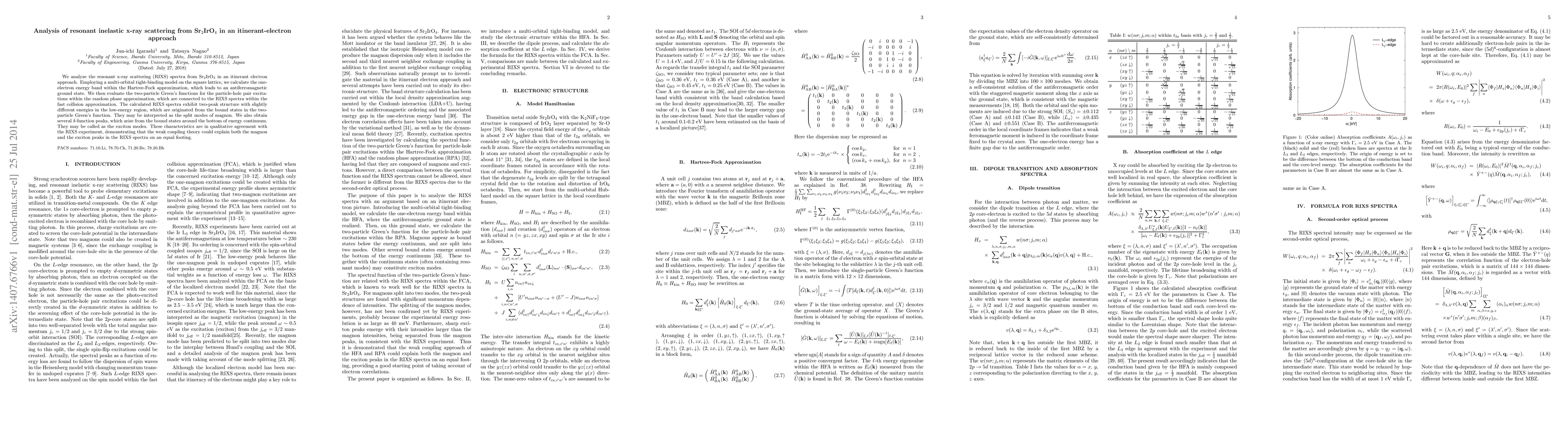 Researchers analyzed resonant x-ray scattering from Sr$_2$IrO$_4$ using an itinerant electron approach, finding two-peak structures in the low-energy region that match magnon peaks, as well as $eta$-function peaks attributed to excitons.
