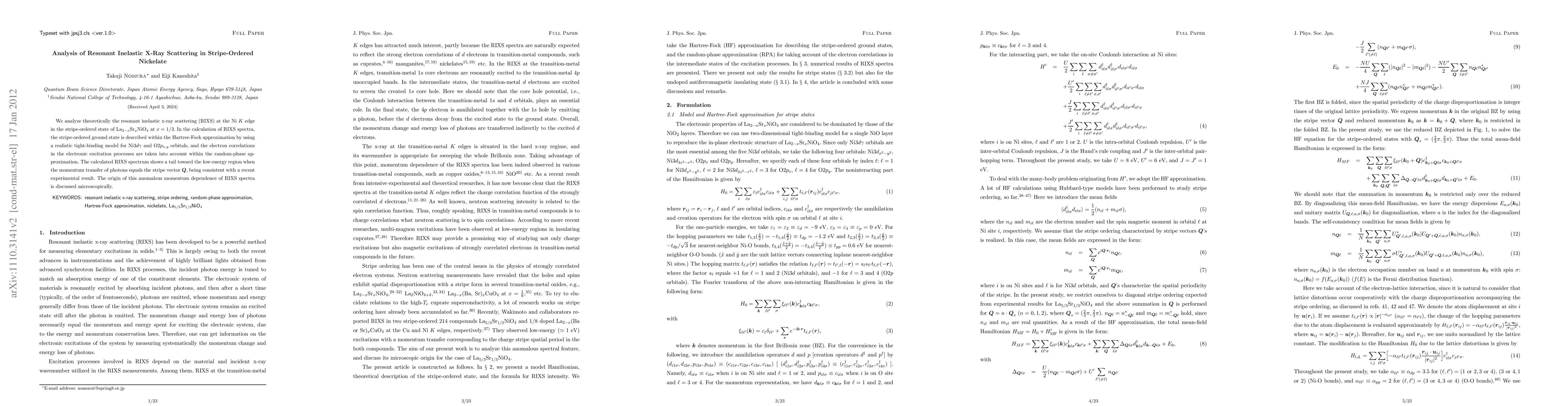 This paper theoretically analyzes resonant inelastic x-ray scattering (RIXS) in stripe-ordered La_{2-x}Sr_xNiO_4 at x=1/3, revealing a low-energy tail in the RIXS spectrum when momentum transfer equals the stripe vector Q, consistent with experimental findings. The study uses a Hartree-Fock approximation and random-phase approximation to account for electron correlations.