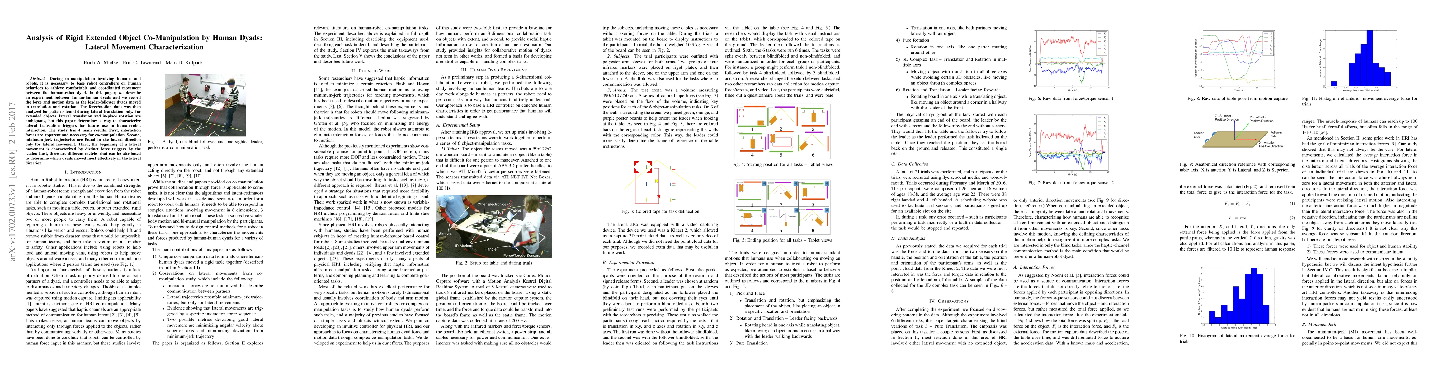 This study investigates human dyads' lateral movement co-manipulation, focusing on force and motion data during translation. The research reveals interaction forces are crucial, identifies minimum-jerk trajectories in lateral translation, and finds distinct force triggers by the leader at the start of lateral movement, providing insights for future human-robot interaction systems.