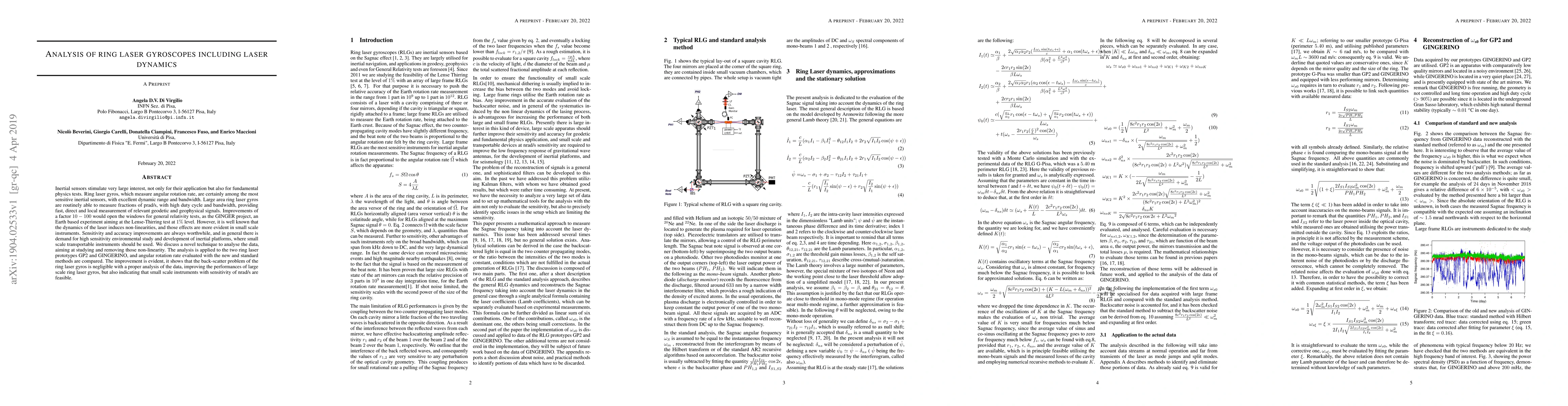 This paper investigates the dynamics of ring laser gyroscopes, focusing on laser-induced non-linearities that affect sensitivity and accuracy. A novel data analysis technique is proposed to mitigate these non-linearities, demonstrating significant improvements in performance for both large and small scale prototypes.