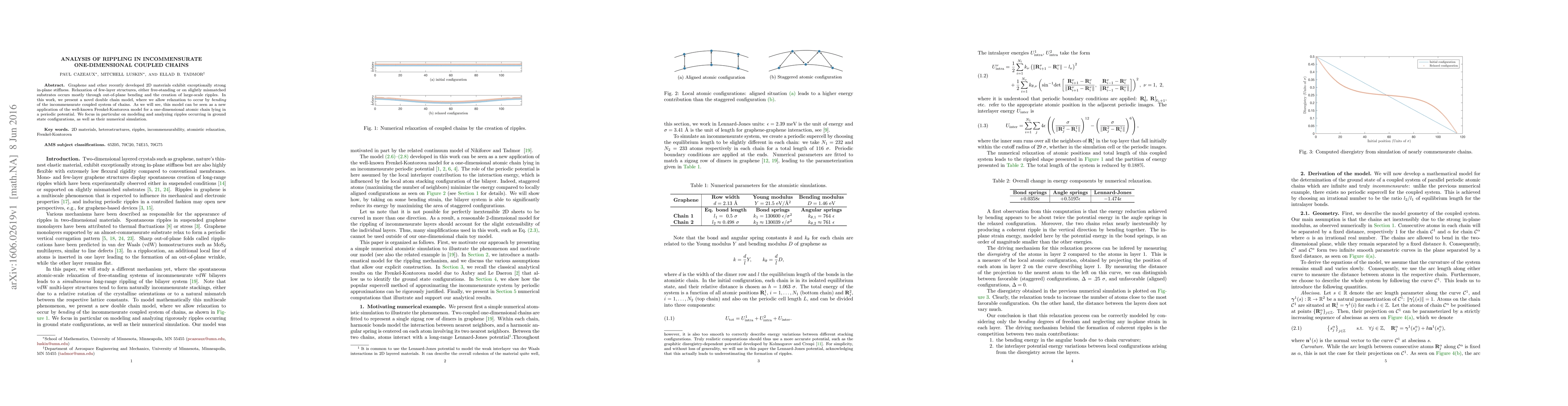 This paper introduces a double chain model to analyze ripples in incommensurate one-dimensional coupled chains, applying the Frenkel-Kontorova model to simulate out-of-plane bending and large-scale ripples in few-layer 2D materials like graphene. The study focuses on modeling and numerically simulating the ground state configurations of these ripples.