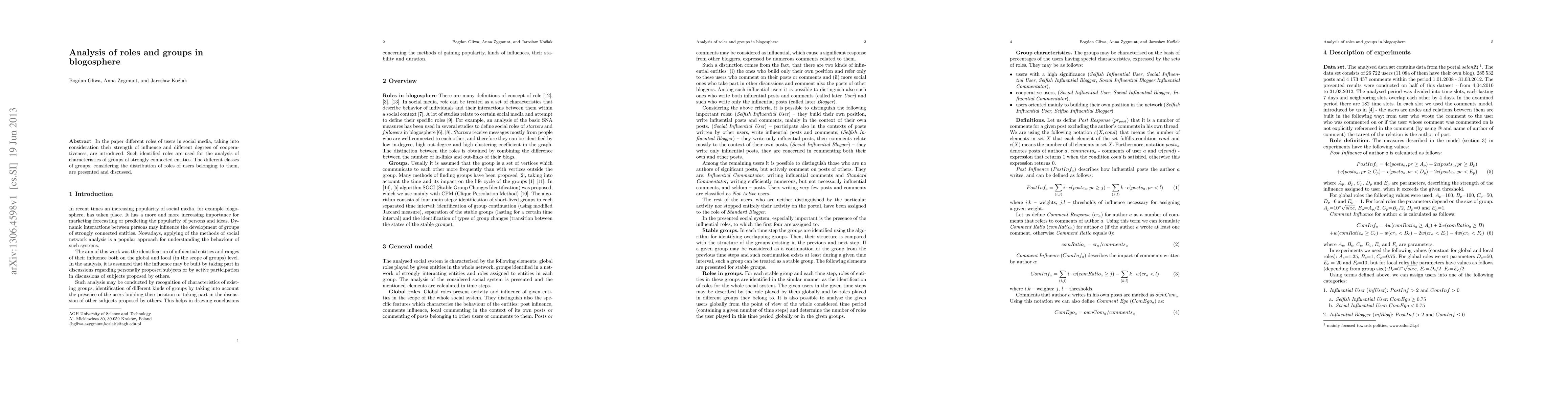 Researchers analyzed roles and groups in blogosphere to identify characteristics of strongly connected entities based on user influence and cooperativeness. Different classes of groups were found with varying role distributions.