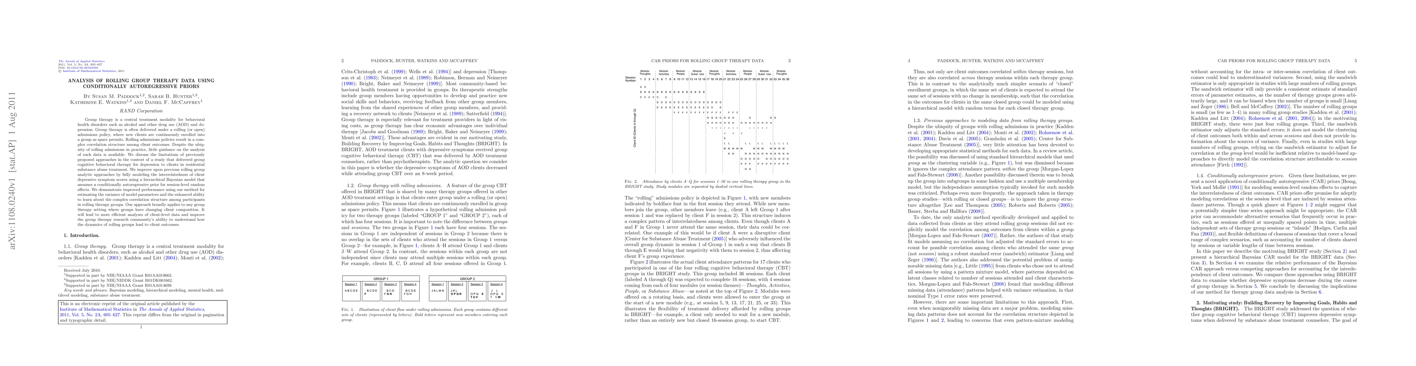 This paper presents a novel hierarchical Bayesian model with conditionally autoregressive priors to analyze data from rolling group therapy sessions, addressing the complex correlation structure inherent in such settings. The method improves parameter variance estimation and understanding of client outcome dynamics in therapy groups with changing compositions.