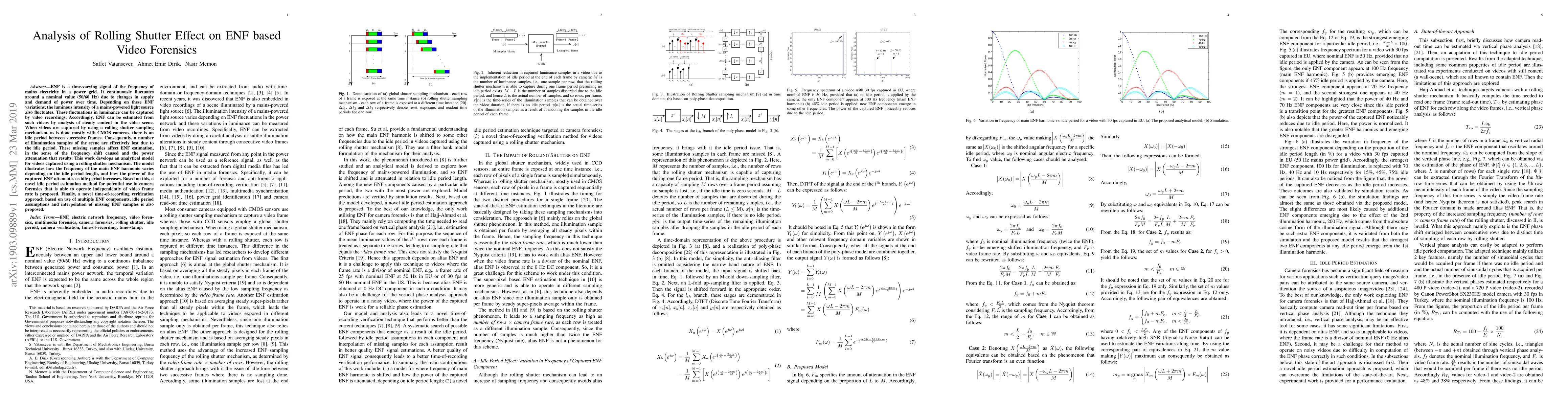 This paper develops an analytical model to estimate ENF (Electricity Network Frequency) from videos captured with a rolling shutter mechanism, enabling the estimation of idle period lengths and time-of-recording verification.
