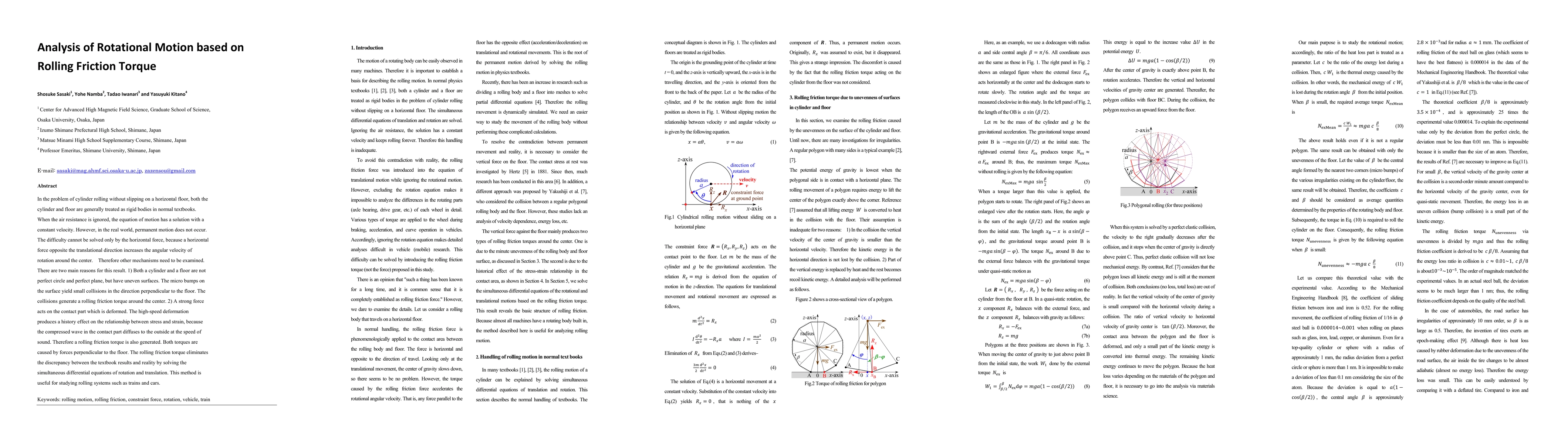 This paper analyzes the rotational motion of a cylinder rolling without slipping on a horizontal floor, attributing the discrepancy between theoretical and real-world motion to rolling friction torque. It identifies two main causes: surface irregularities generating perpendicular collisions and high-speed deformation at the contact point producing a history effect, both contributing to the rolling friction torque that aligns theoretical predictions with real-world observations.