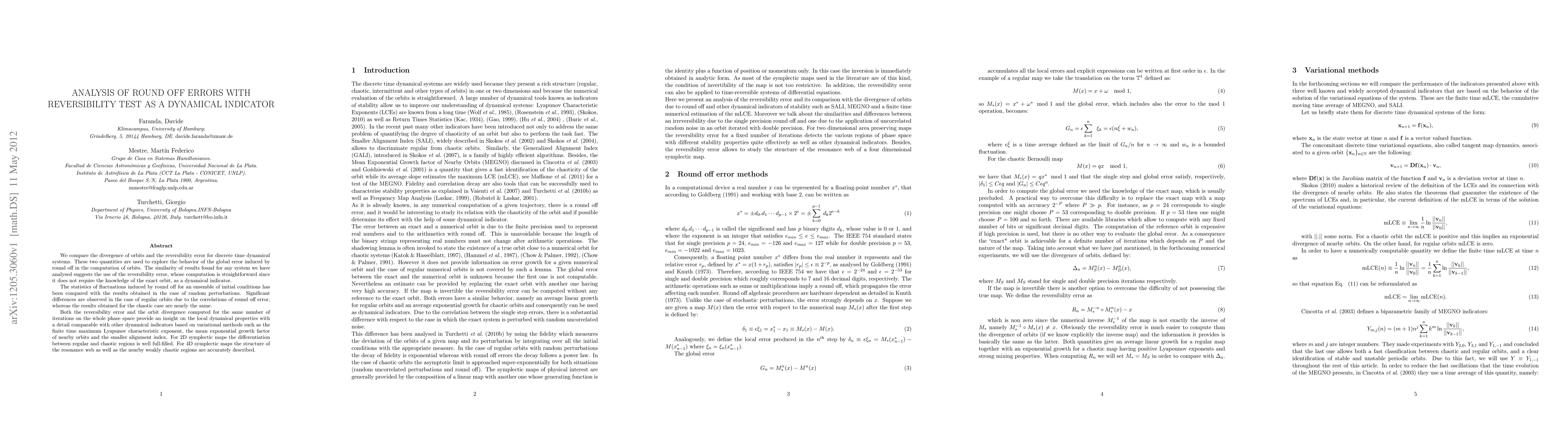 Researchers used reversibility error as a dynamical indicator to analyze round off errors in computing orbits of discrete time systems, finding significant differences for regular orbits and similar results for chaotic cases.