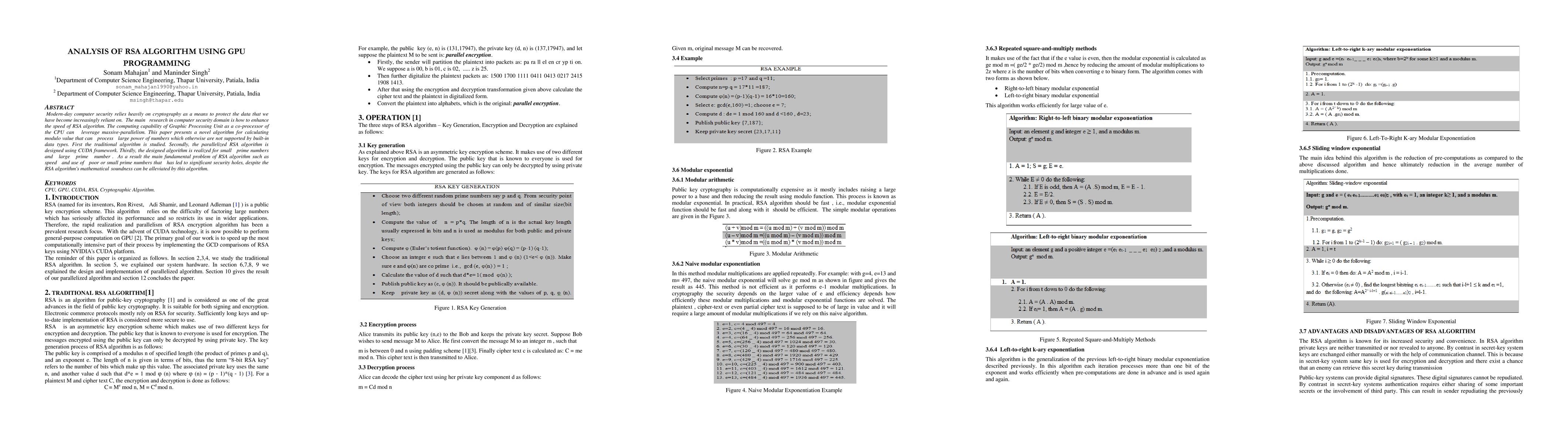 This work distinguishes itself by focusing on GPU-accelerated computation for RSA, particularly addressing the challenge of handling large prime numbers and providing a novel algorithm for calculating modulo values that extend beyond built-in data type limitations.
