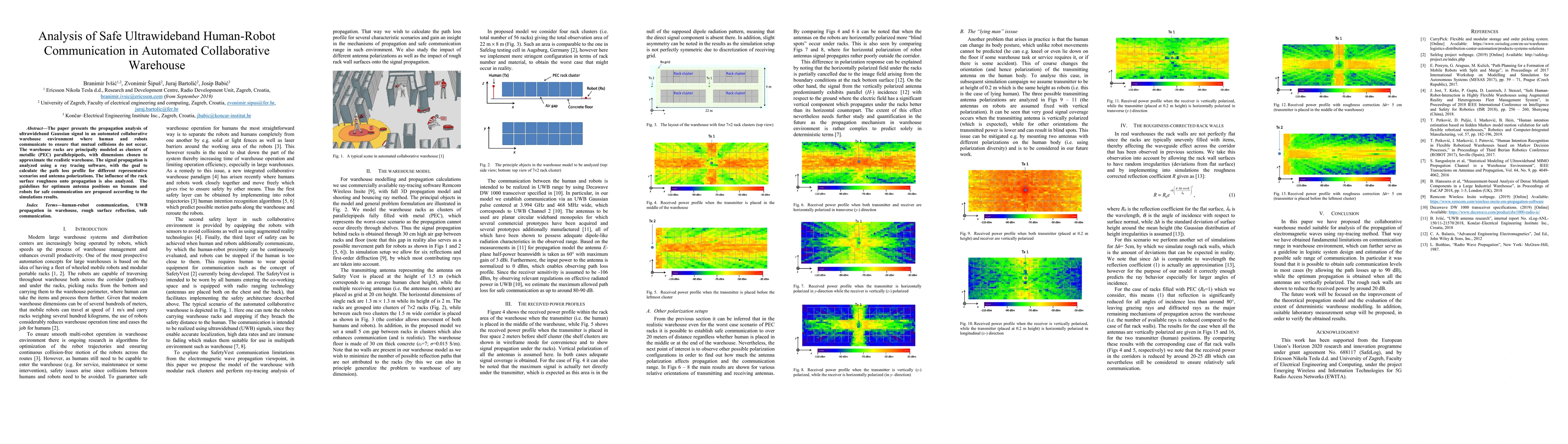 This paper analyzes the propagation of ultrawideband signals in an automated warehouse, focusing on safe human-robot communication to prevent collisions. Using ray tracing software, it calculates path loss profiles and examines the impact of warehouse rack surface roughness, proposing optimal antenna placements for effective communication.