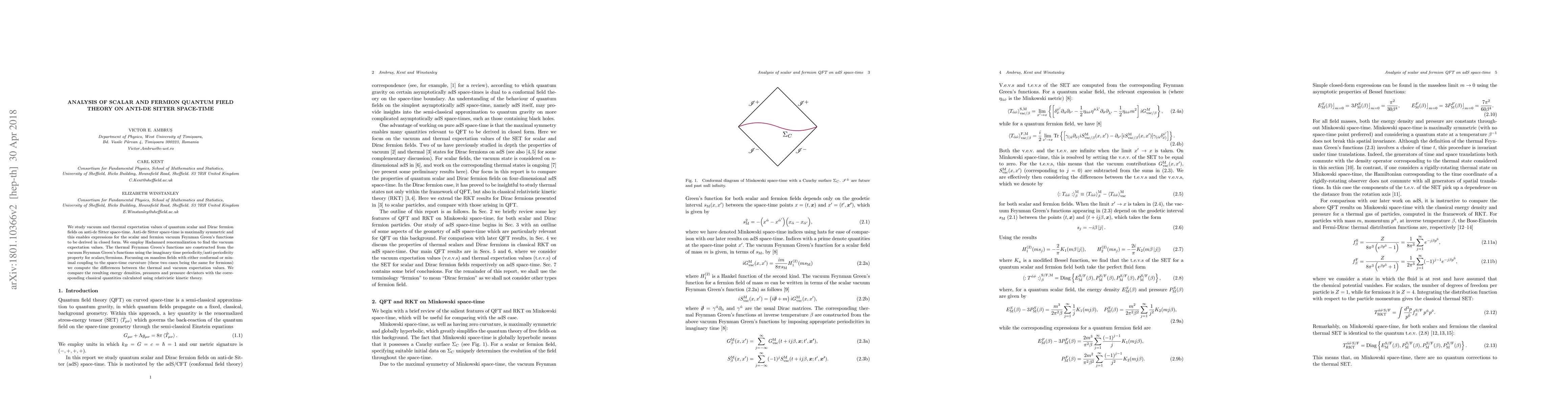 This paper analyzes vacuum and thermal expectation values of scalar and fermion quantum fields in anti-de Sitter space-time, deriving closed-form expressions for vacuum Feynman Green's functions and employing Hadamard renormalization. It computes differences between thermal and vacuum energy densities, pressures, and pressure deviators, comparing them to classical relativistic kinetic theory results.