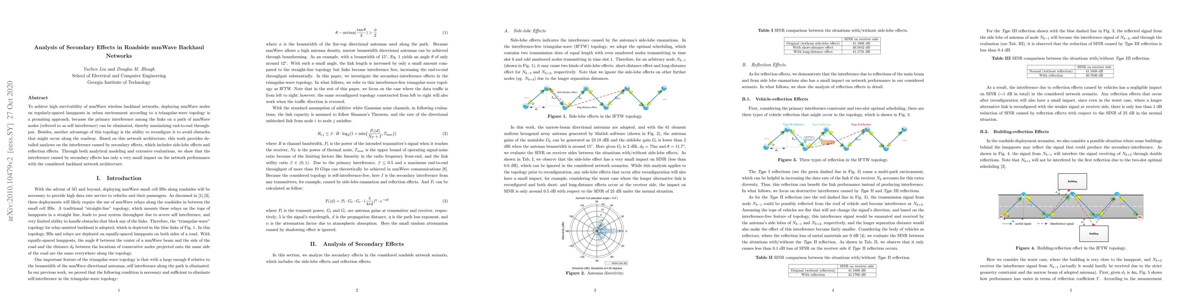This paper analyzes secondary interference effects, such as side-lobe and reflection impacts, in mmWave backhaul networks deployed on lampposts in urban areas using a triangular-wave topology. The study finds that these secondary effects have minimal impact on network performance due to the network's design.