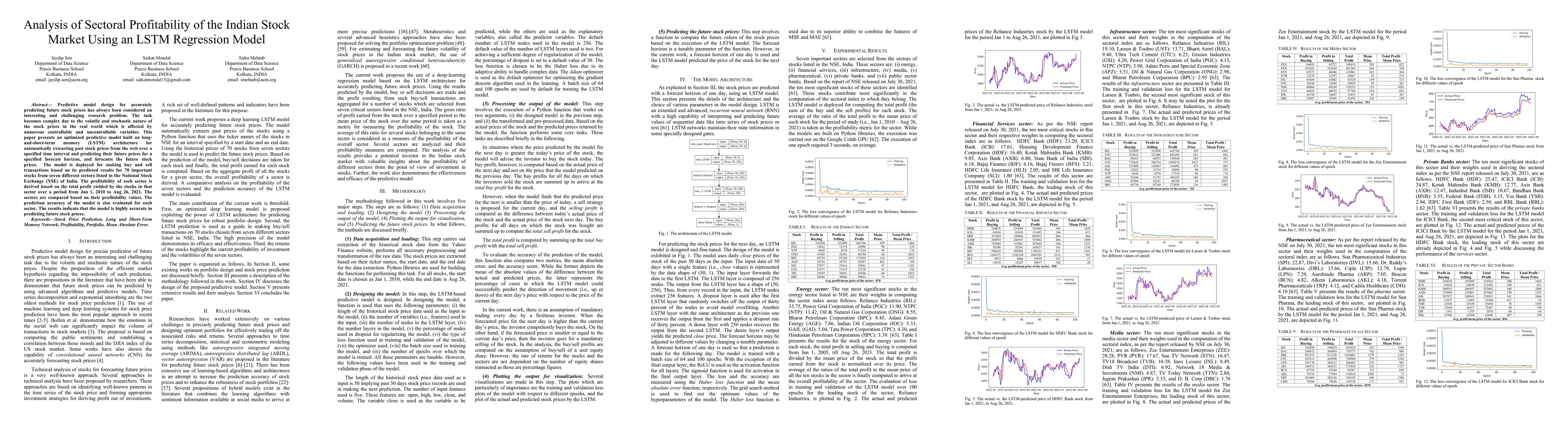 This paper develops an LSTM regression model to predict future stock prices for 70 Indian NSE stocks across seven sectors, assessing sectoral profitability based on model-driven buy/sell transactions from 2010 to 2021, and finds high prediction accuracy.