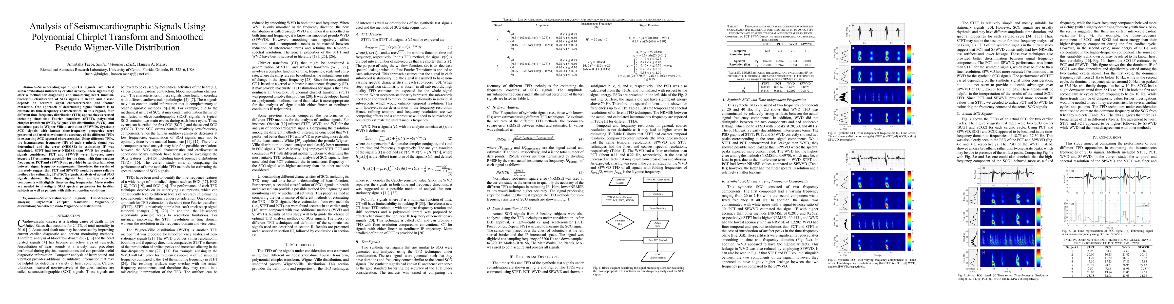 This paper evaluates the effectiveness of various time-frequency distribution methods for analyzing seismocardiographic signals, finding that the polynomial chirplet transform and smoothed pseudo Wigner-Ville distribution are more accurate for estimating instantaneous frequency and better discriminate between frequency components compared to other methods.
