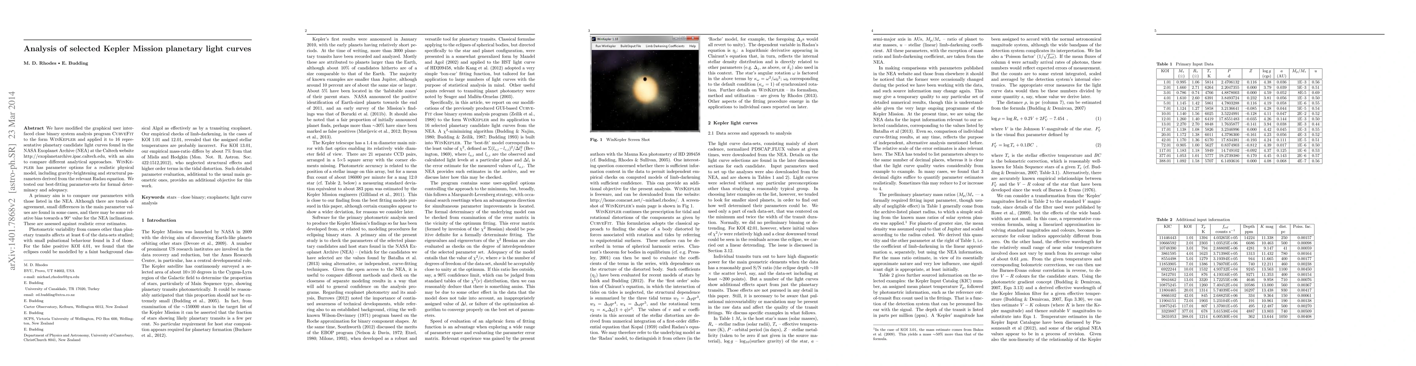 We have modified the graphical user interfaced close binary system analysis program CurveFit to the form WinKepler and applied it to 16 representative planetary candidate light curves found in the NASA Exoplanet Archive (NEA) at the Caltech website http://exoplanetarchive.ipac.caltech.edu, with an aim to compare different analytical approaches. WinKepler has parameter options for a realistic physical model, including gravity-brightening and structural parameters derived from the relevant Radau equation. We tested our best-fitting parameter-sets for formal determinacy and adequacy. A primary aim is to compare our parameters with those listed in the NEA. Although there are trends of agreement, small differences in the main parameter values are found in some cases, and there may be some relative bias towards a 90 degrees value for the NEA inclinations. These are assessed against realistic error estimates. Photometric variability from causes other than planetary transits affects at least 6 of the data-sets studied; with small pulsational behaviour found in 3 of those. For the false positive KOI 4.01, we found that the eclipses could be modelled by a faint background classical Algol as effectively as by a transiting exoplanet. Our empirical checks of limb-darkening, in the cases of KOI 1.01 and 12.01, revealed that the assigned stellar temperatures are probably incorrect. For KOI 13.01, our empirical mass-ratio differs by about 7% from that of Mislis and Hodgkin (2012), who neglected structural effects and higher order terms in the tidal distortion. Such detailed parameter evaluation, additional to the usual main geometric ones, provides an additional objective for this work.
