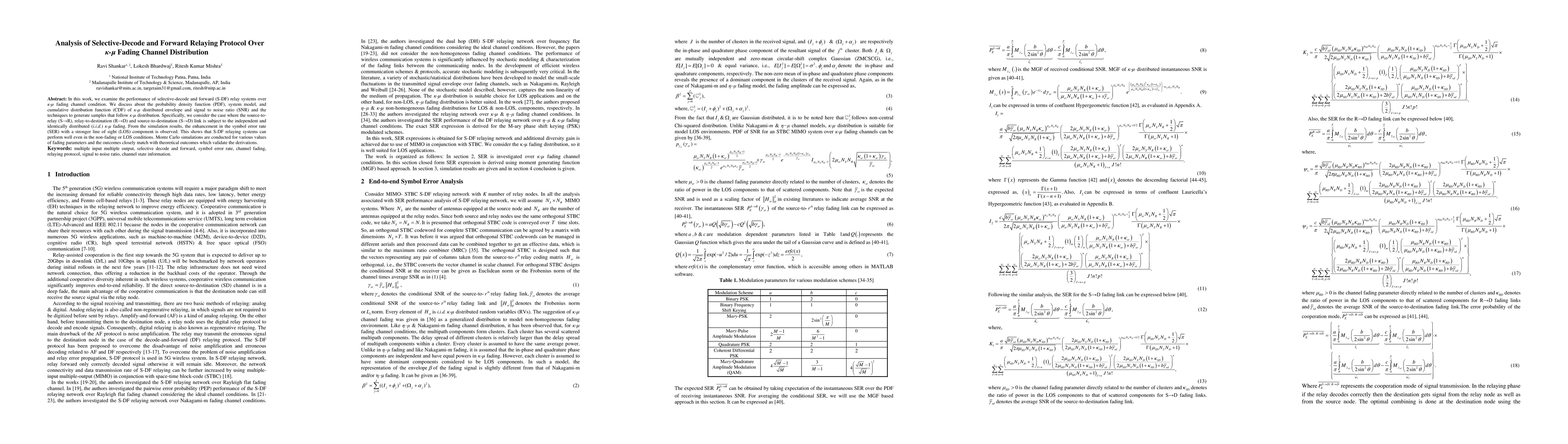 In this work, we examine the performance of selective-decode and forward (S-DF) relay systems over kappa-mu fading channel condition. We discuss about the probability density function (PDF), system model, and cumulative distribution function (CDF) of kappa-mu distributed envelope and signal to noise ratio (SNR) and the techniques to generate samples that follow kappa-mu distribution. Specifically, we consider the case where the source-to-relay (SR), relay-to-destination (RD) and source-to-destination (SD) link is subject to the independent and identically distributed (i.i.d.) kappa-mu fading. From the simulation results, the enhancement in the symbol error rate (SER) with a stronger line of sight (LOS) component is observed. This shows that S-DF relaying systems can perform well even in the non-fading or LOS conditions. Monte Carlo simulations are conducted for various values of fading parameters and the outcomes closely match with theoretical outcomes which validate the derivations.